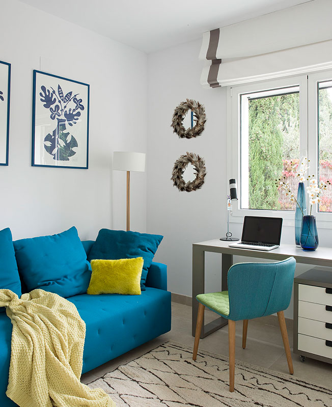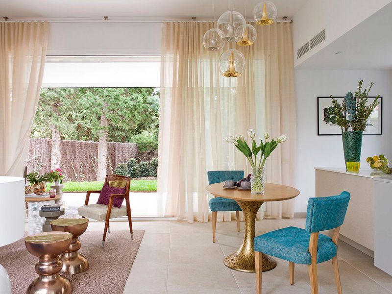 Высказывая пожелания к будущему интерьеру, заказчики говорили о свете, легкости и цвете. Стены выкрасили в нейтральные белые оттенки, добавили песчаные и бирюзовые детали и акценты — палитра напоминает о морском пляже и настраивает на отдых. Когда дошла очередь до обстановки, я сосредоточилась на создании уютного и обжитого пространства. Мебель и аксессуары собирались и заказывались со всего света, покупались на блошиных рынках».