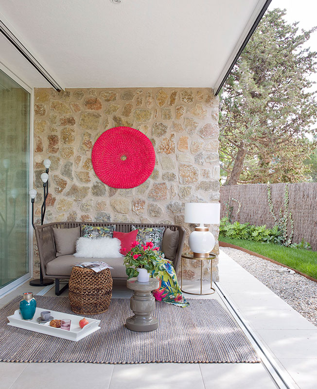 Терраса. Диван, Kettal. Напольный и настольный светильник, Flam & Luce. Плетеный столик, Zara Home. Соломенный круг выкрашен в красный цвет дизайнером.