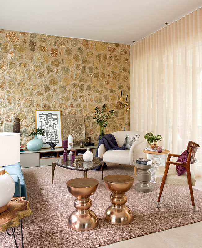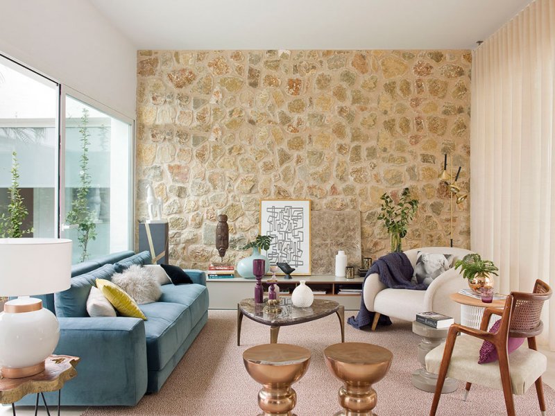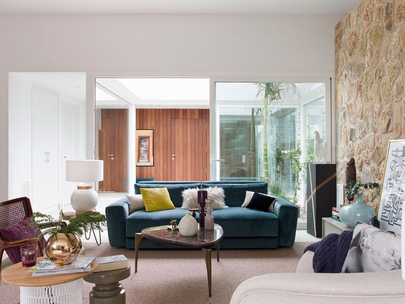 Не смотря на это затруднение, проект стал для меня совершенно особенным, благодаря конструкции виллы. Одна из особенностей — внутренний дворик, на который выходят панорамные окна и двери жилых комнат. Вторая необычная деталь — фактурная каменная стена, как бережно сохраненный фрагмент старого здания.