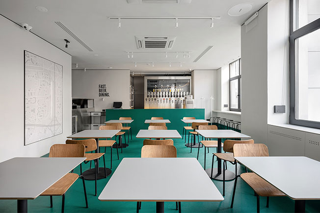 Команда архитекторов balbek bureau разработала дизайн пивного ресторана FOODOO в Киеве. Сложость проекта заключалась в сжатых сроках реализации (всего 100 дней) и необходимости создать пространство для большой проходимости посетителей. В соответствии с концепцией демократичного заведения перед авторами ставили задачу сделать интерьер практичным и долговечным. Также дизайн должен был быть универсальным и быстрым в реализации — для будущих заведений этой сети. Пространство 130 кв. метров не перегружено цветом и декором. Особое внимание авторы уделили архитектуре пространства. В месте соединения потолков и стен сделали теневой шов из алюминиевого профиля, который добавил помещению контраста, а также визуально его «вытянул». Для отделки пола архитекторы выбрали мармолеум за счет его износостойкости и экологичности. Материал плавно переходит с пола на барную стойку и стены — место соединения также оформили черным металлическим профилем. Фирменным цветом был выбран насыщенный зеленый, акцентированный монохромными светлыми стенами и натуральной кожей в обивке сидений. При выборе мебели предпочтение отдавали украинским брендам. Стулья, столешницы, напольные вешалки — от мастерской propro. Возле входа расположена зона ожидания заказа «с собой» — здесь посетители могут отдохнуть на необычных цилиндрических сиденьях с навесными столиками. Символом заведения стал космонавт 2,5 метра высотой из полиэстера от скульптора Кирилла Гузенко — в духе instagram-friendly он сразу же полюбился гостям ресторана. Также в кафе разместили три декоративные группы — чертеж ракеты «Союз», стилизованную карту жилого комплекса на левом берегу Днепра (идея состоит в том, чтобы гости отмечали на ней свои дома) и ноты мировых шедевров принципиально разных жанров от Queen, Rolling Stones и Metallica до Боба Марли, Тупака Шакура и Вивальди. nonehttps://www.instagram.com/balbekbureau/https://www.facebook.com/balbekbureauarchitects/https://www.balbek.com/ • Киев, Княжий затон, 21.