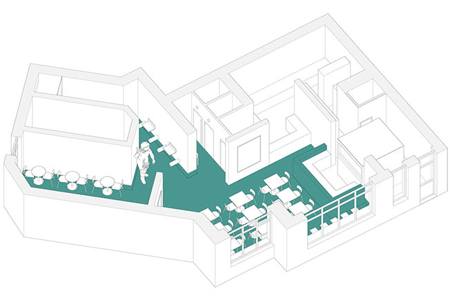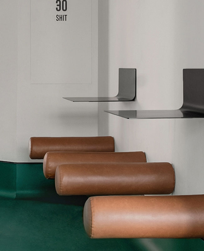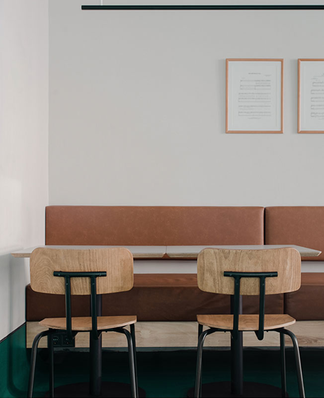 Фирменным цветом был выбран насыщенный зеленый, акцентированный монохромными светлыми стенами и натуральной кожей в обивке сидений. При выборе мебели предпочтение отдавали украинским брендам. Стулья, столешницы, напольные вешалки — от мастерской propro. Возле входа расположена зона ожидания заказа «с собой» — здесь посетители могут отдохнуть на необычных цилиндрических сиденьях с навесными столиками.