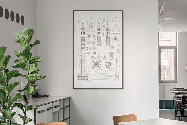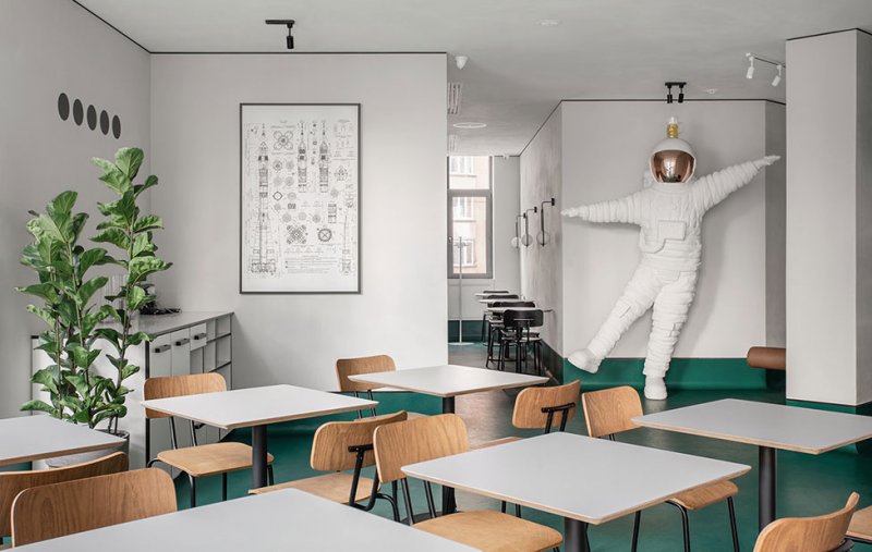 Символом заведения стал космонавт 2,5 метра высотой из полиэстера от скульптора Кирилла Гузенко — в духе instagram-friendly он сразу же полюбился гостям ресторана. Также в кафе разместили три декоративные группы — чертеж ракеты «Союз», стилизованную карту жилого комплекса на левом берегу Днепра (идея состоит в том, чтобы гости отмечали на ней свои дома) и ноты мировых шедевров принципиально разных жанров от Queen, Rolling Stones и Metallica до Боба Марли, Тупака Шакура и Вивальди.