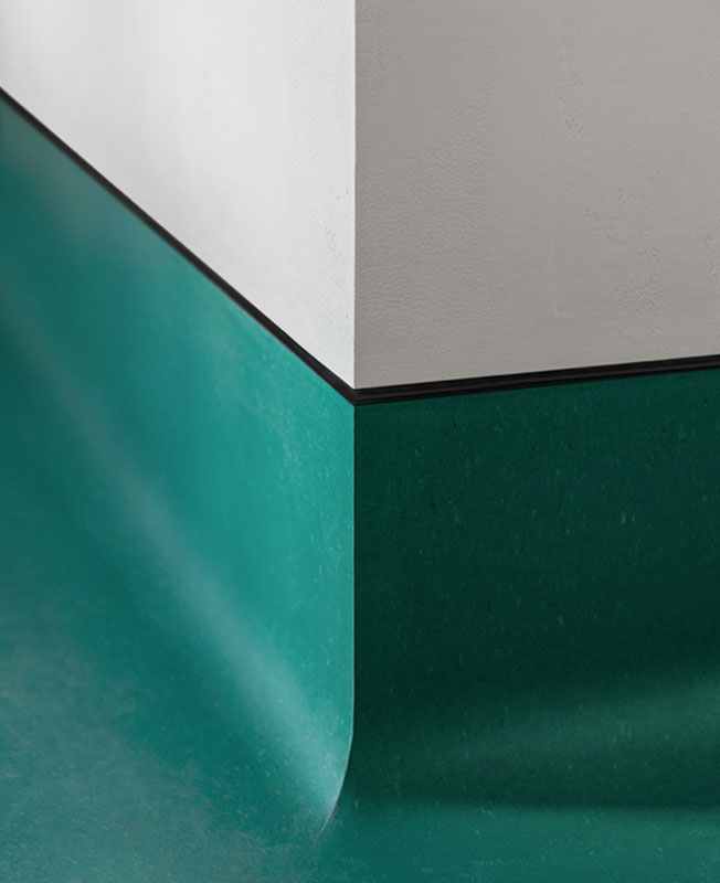 Для отделки пола архитекторы выбрали мармолеум за счет его износостойкости и экологичности. Материал плавно переходит с пола на барную стойку и стены — место соединения также оформили черным металлическим профилем.