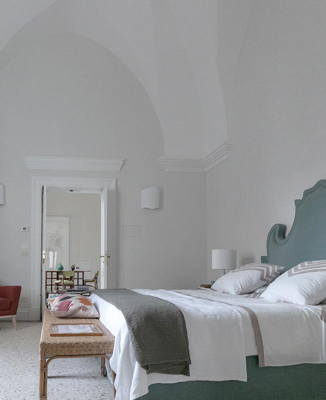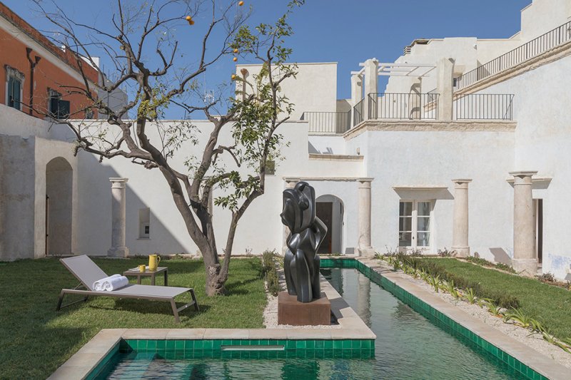 Ги Мартен, шеф-повар одного из старейших парижских ресторанов Le Grand Vefour с двумя звездами Мишлен, и его жена, продюсер Катерина Маркс, отреставрировали два итальянских палаццо и превратили их в отель с фокусом на дизайн и искусство. Палаццо Маритати и палаццо Мучи расположены в Нардо, в регионе Саленто в Апулии. Они находятся менее чем в десяти минутах друг от друга и в нескольких километрах от Порто Сельваджо, природного заповедника с видом на побережье Ионического моря. В отеле гостям доступны 10 номеров, включая три сьюта, просторная терраса для отдыха и бассейн. Работа над проектом началась летом 2015 года. Гай и Катерина отдыхали в Апулии и в последний день поездки оказались в палаццо, выставленном на продажу. Рядом обнаружили второе. Решение супруги приняли через несколько дней и вскоре стали владельцами недвижимости, над которой, несмотря на весь ее потенциал, предстояло серьезно поработать. «У меня есть жилье в Китае и Полинезии, но с тех пор, как я открыл для себя Апулию в 2015 году и купил резиденции, приезжаю сюда раз в месяц, а летом так часто, как это возможно», — говорит Ги Мартен. На реставрацию двух палаццо ушло три года. Здания объединили в одну гостиничную структуру, переделали часть стен и крыши. Чтобы создать комфортное для пребывания пространство, не меняя архитектурный облик построек XVIII века, пригласили Луиджи Риппу, архитектора итальянских исторических памятников, и его жену Сабину, специалиста по свету, а также краснодеревщиков, мастеров по мозаике, декору. Исторические детали бережно сохранили — от арочных потолков до фресок, которые можно увидеть в общественных пространствах и некоторых номерах, каждый из которых еще в прошлом столетии был жильем для целой семьи. Продуманное непрямое освещение — заслуга Сабины Риппа — подчеркивает архитектуру палаццо и выявляет их характерные особенности. Обустроить интерьеры помог декоратор Жером Файан-Дюма, предложивший в качестве нейтрального фона белые стены и занавески, а в спальнях — эффектные фигурные изголовья, созданные по его дизайну. Он же спроектировал светло-зеленый кухонный гарнитур. В выборе остальной мебели и аксессуаров Катерина и Ги принимали самое активное участие. Катерина серьезно интересуется дизайном и декором, недавно она открыла свой магазин предметов для дома в Нардо. Для палаццо супруги выбрали вещи Джо Понти, Этторе Соттсасса, Алвара Аалто, Ман Рэя, Тобиа Скарпы, Тапио Вирккалы , Джанфранко Фраттини, Паоло Буффы, Бента Карлби, Чарльза Ренни Макинтоша, Лоранс Боннель, которые давно собирали. «В библиотеке стоит книжный шкаф Ико Паризи: я знал, какая модель мне нужна и долго искал ее, прежде чем обнаружил благодаря римскому антиквару Паоло Стурни, — говорит Ги Мартен. — Мы хотели быть как дома, быть щедрыми с этим местом. Я привез свои собственные книги, одну из моих стереосистем с винилом». Антиквариат XVIII века соседствует с плетеной мебелью Sika Design, керамика Гуэррино Трамонти с артом Клодин Дрей, Женевьевы Клесе, Франсуазы Петрович и фотографиями Жозефин Валье Франсши (Josephine Valle Franceschi). «Мы действительно уделили большое внимание деталям и хотим поделиться этим с гостями. Это скорее место искусства, а не просто отель». • От 150 евро за ночь. Ги Мартен.