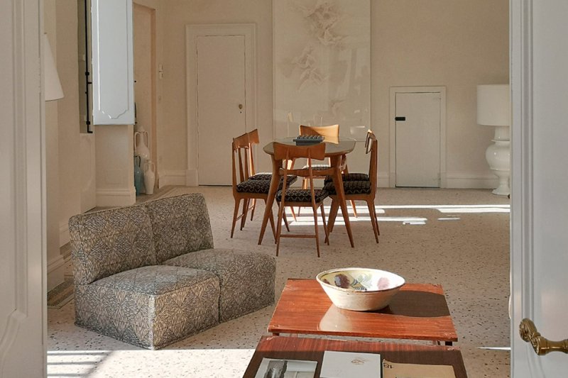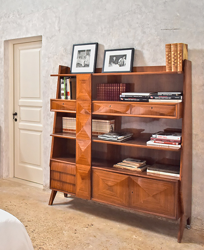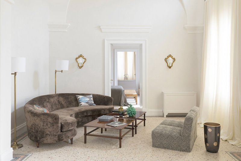 Для палаццо супруги выбрали вещи Джо Понти, Этторе Соттсасса, Алвара Аалто, Ман Рэя, Тобиа Скарпы,Тапио Вирккалы, Джанфранко Фраттини, Паоло Буффы, Бента Карлби, Чарльза Ренни Макинтоша, Лоранс Боннель, которые давно собирали. «В библиотеке стоит книжный шкаф Ико Паризи: я знал, какая модель мне нужна и долго искал ее, прежде чем обнаружил благодаря римскому антиквару Паоло Стурни, — говорит Ги Мартен. — Мы хотели быть как дома, быть щедрыми с этим местом. Я привез свои собственные книги, одну из моих стереосистем с винилом».