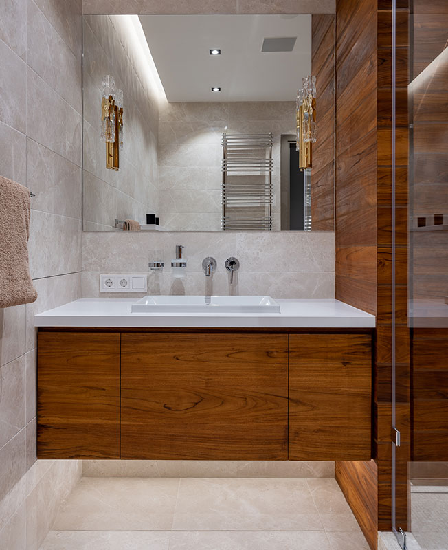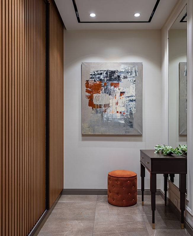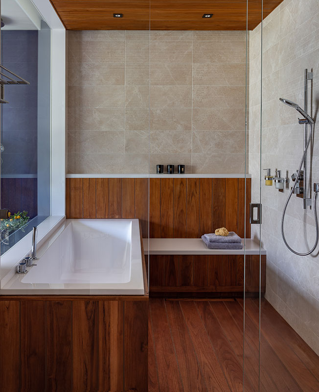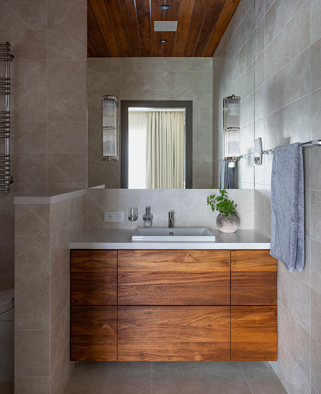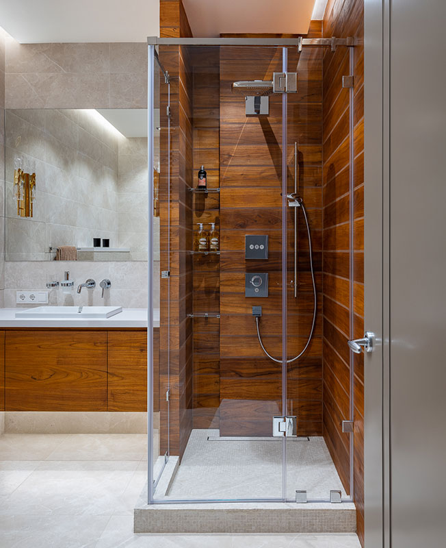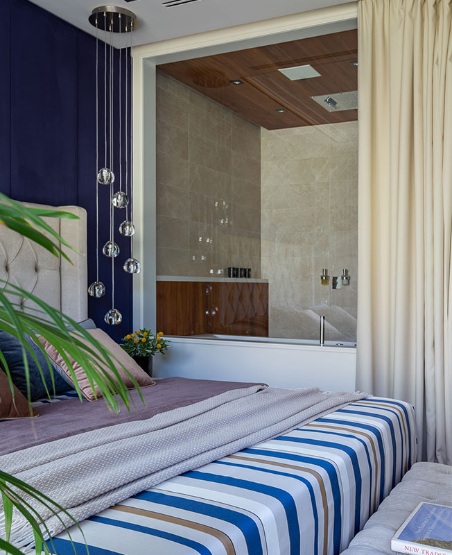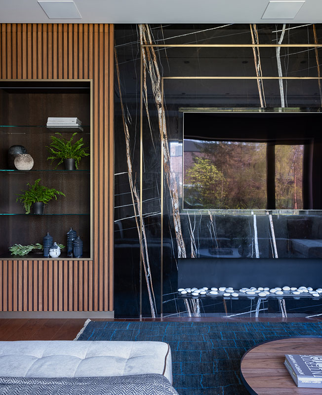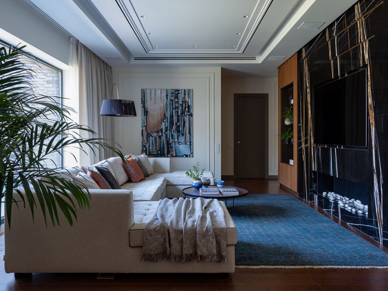 Особенно эффектно смотрится зона для ТВ с камином в отделке натуральным мрамором. Также в проекте использовали шпон ореха, который гармонично дополняет стекло и камень, а также древесину тика в ванных комнатах — такое решение напоминает о виллах на побережье.