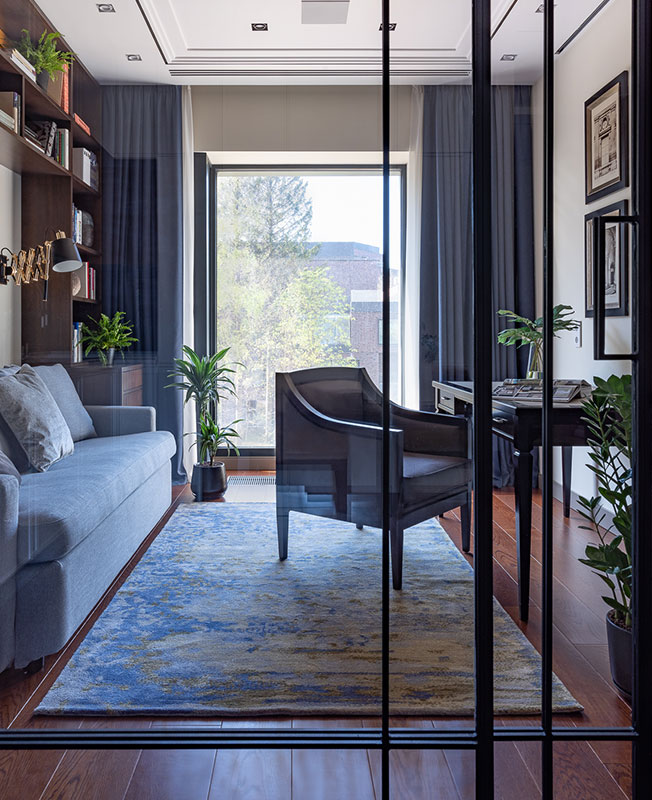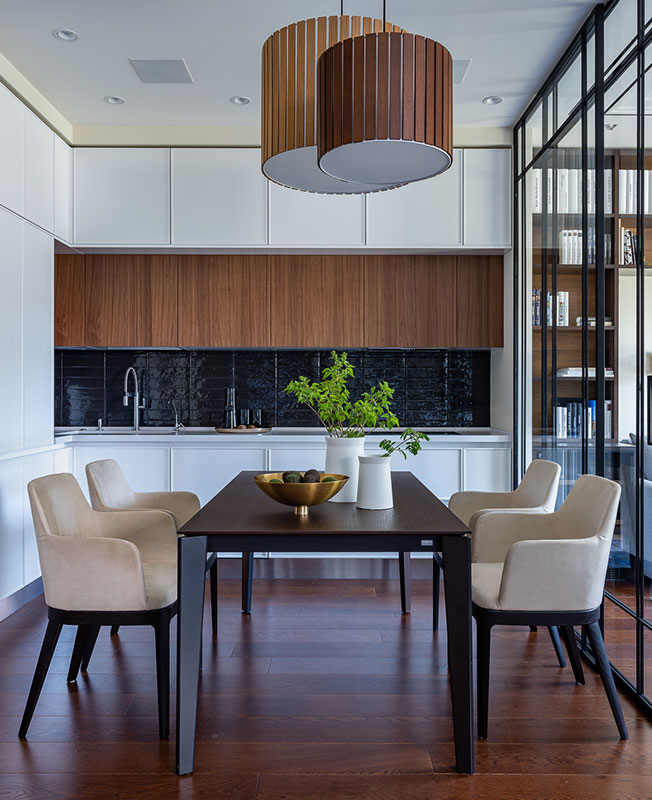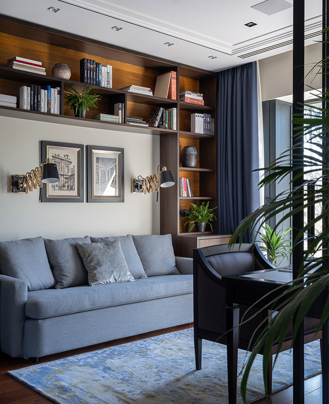 В квартире были сформированы гостиная, совмещенная с кухней и кабинетом, спальня с отдельной ванной комнатой и гардеробной, детская, общая гардеробная, санузел, в также постирочная в зоне прихожей. Практически всю корпусную и мягкую мебель изготовили на заказ по эскизам дизайнера, кресла и диваны при этом привезли из Италии.