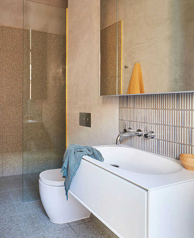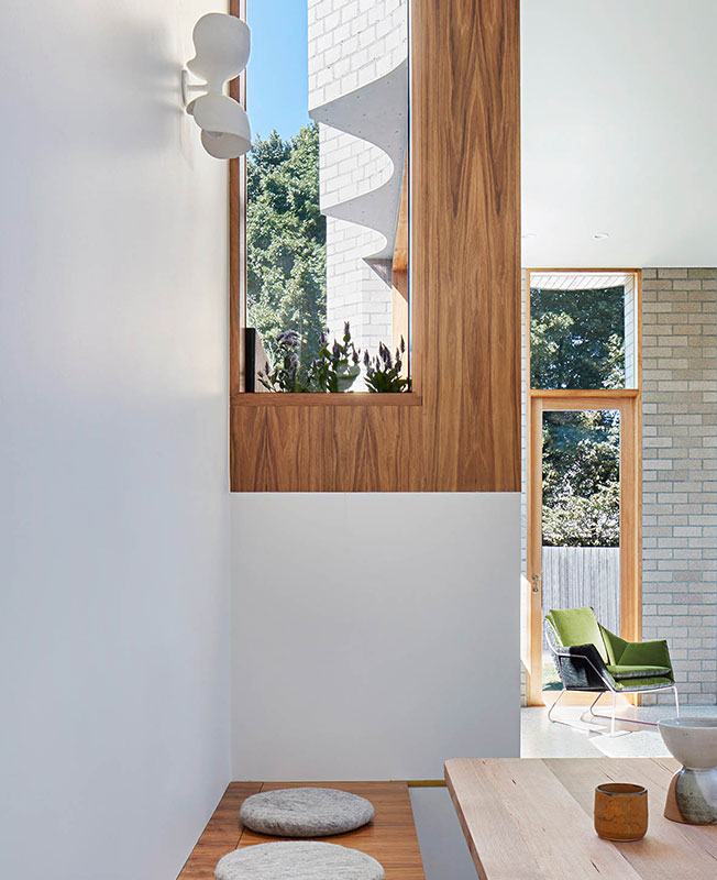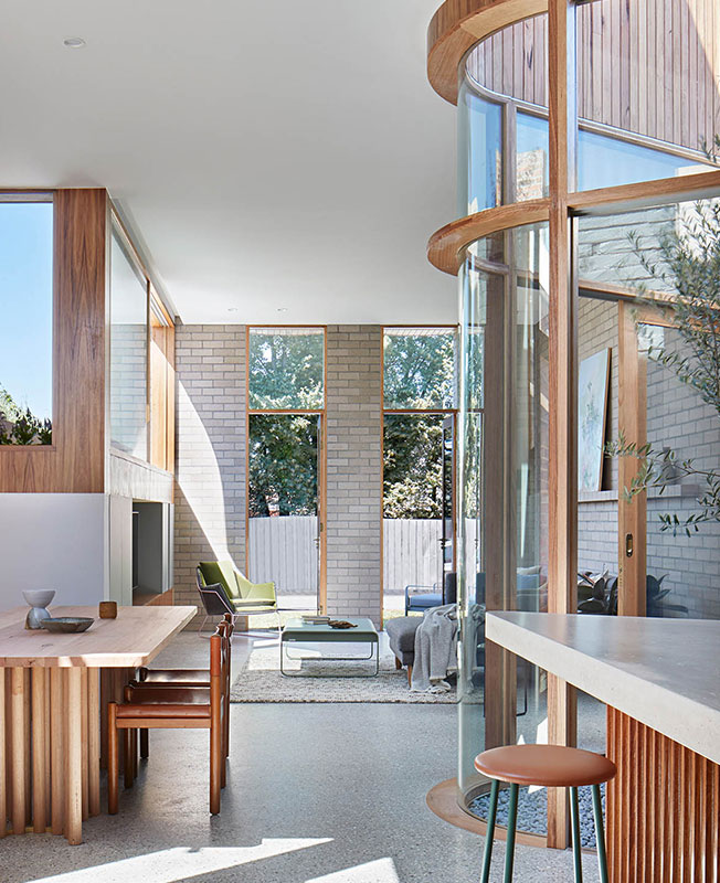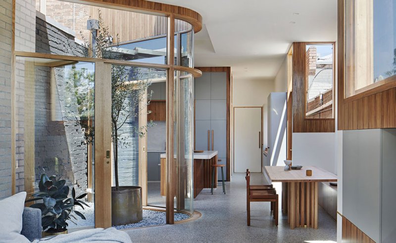 Треугольный двор с изогнутым стеклянным углом рассекает пространство, разделяя кухню и жилые помещения и направляя свет в глубину дома. Кирпичная кладка обнажена. Панорамные окна встроены в разные части дома — стеклянный цилиндр вписан в кухню, а метровые окна приподняты к потолку в гостиной, чтобы впускать больше дневного света.