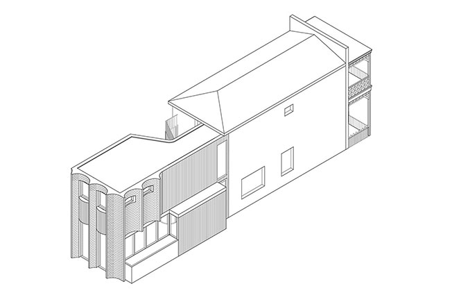 Задний двор довольно компактен, поэтому фасад виден с близкого расстояния, а объем возвышается над ним. Фасад — это скорее жест для публики. Внутренне, дом раскрывается медленнее. Владельцы описали свое будущее жэилье как дом-путешествие и дом открытий.