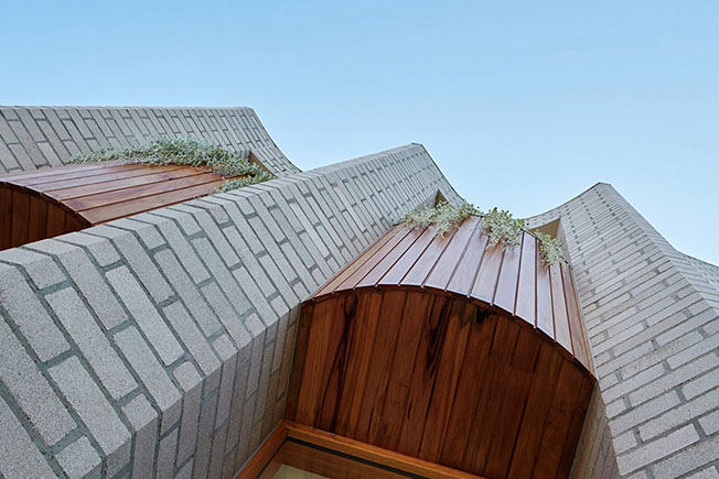 Моник Вудворд, директор Wowowa Architecture, говорит, что их бюро находит вдохновение в самых нетривиальных вещах, например, в панцыре креветки или в листе боярышника. Построенный из бледных серебристо-коричневых кирпичей, двухэтажный монолит поднимается над землей и представляет собой экструдированное зубчатое строение. Скульптурная форма здания дополнена деревянными балконами и стеклянным входом. Похожая на водоросли драпирующая зелень свешивается с балконов.