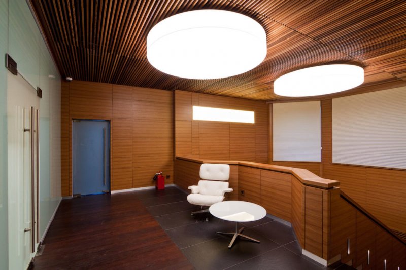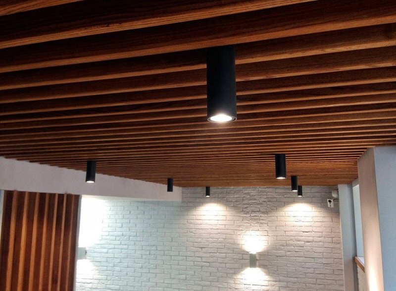 Деревянные реечные потолки, несмотря на то, что занимают некоторое количество свободного пространства, в большинстве случаев выигрышно смотрятся в интерьере. Подвесная конструкция позволяет дополнительно не маскировать любые косметические дефекты плиты потолка, неровные швы, даже остатки предыдущего потолочного покрытия, если его не удалось снять до конца.