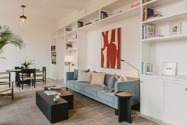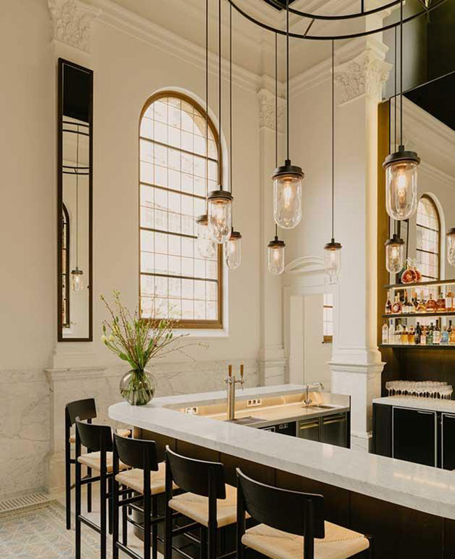 Невероятно высокие потолки, отреставрированные напольные плитки и огромные арочные окна образуют впечатляющий фон, на котором ван Дейзен развесил светильники Flos, расставил черные кожаные диваны и низкие столы.
