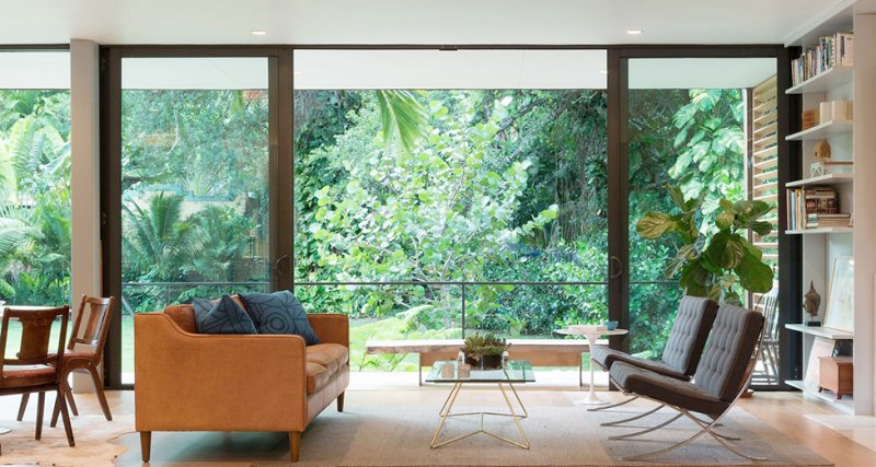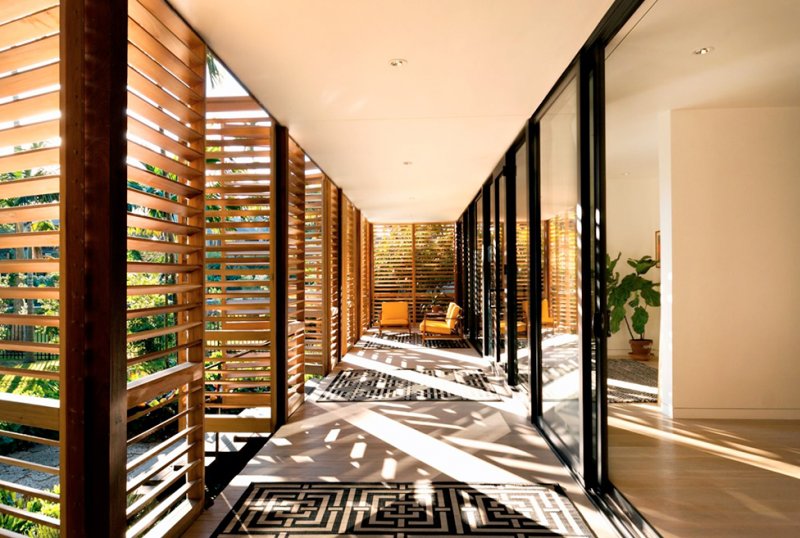 Жалюзи защищают от ветра и солнца, а также огораживают просторную террасу. Стеклянные двери могут полностью открываться на улицу, объединяя внешнее и внутреннее пространства. Внутри стеклянным стенам противопосталены различные виды древесины, включая вишню, дуб и красный кипарис.