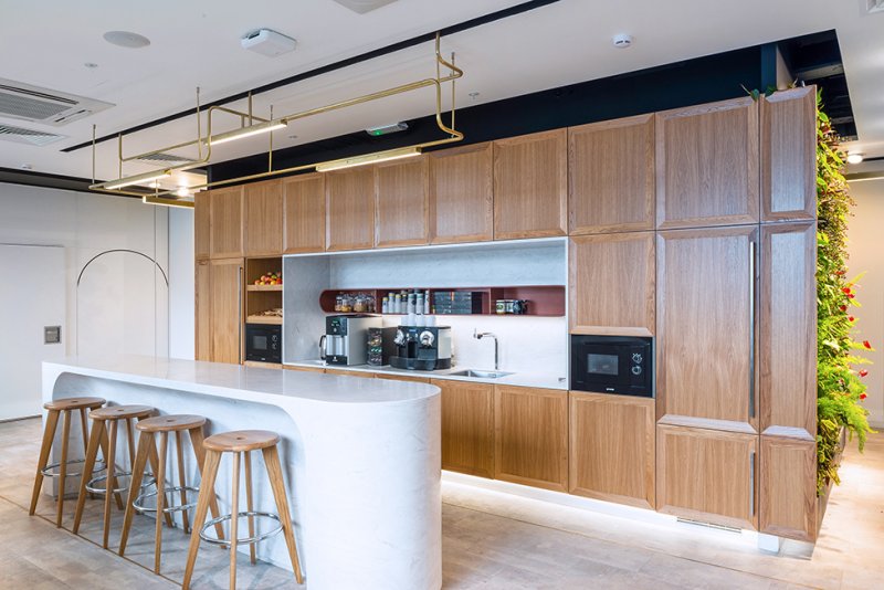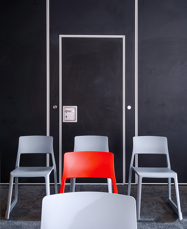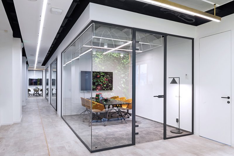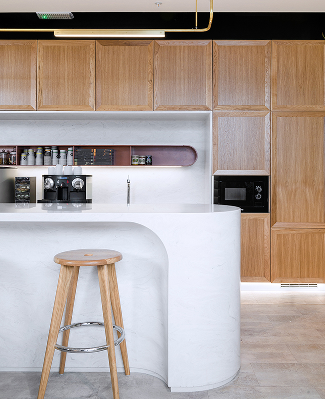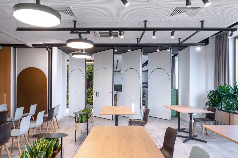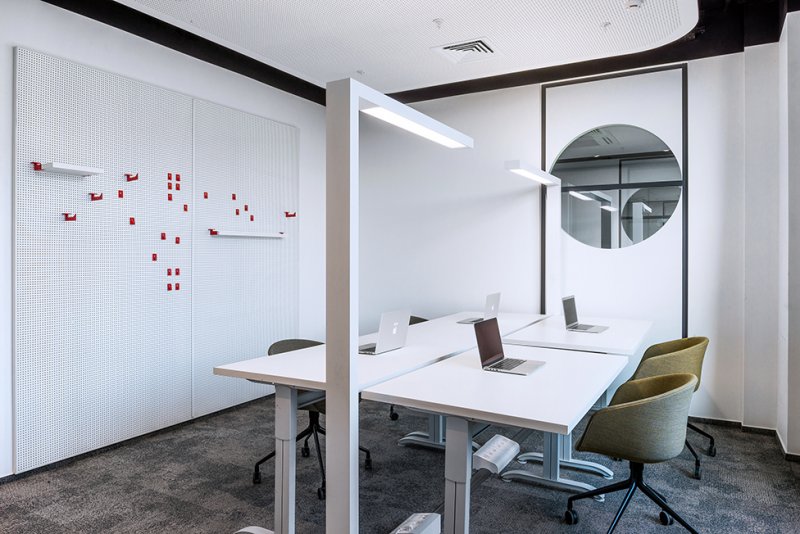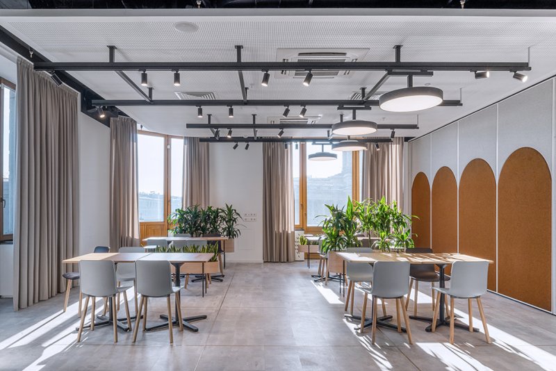 Изначальная планировка оказалась вполне удачной, а просторные помещения позволили создать многофункциональные пространства. «Столовая трансформируется в конференц-зал с помощью слайдинговых перегородок со звукоизоляцией до 54 дБ, — рассказывают архитекторы. — С одной из сторон они отделаны тканью, с другой представляют собой маркерные доски. Кроме столовой и рабочих кабинетов в офисе выделены зоны рецепции, кухни, переговорные и лаундж».