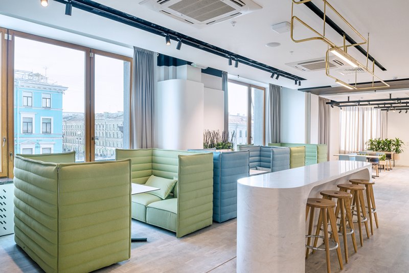 Интерьер решили построить на констрастах, чтобы соединить стилистику исторического здания и атрибуты технологичного IT-офиса. «Интересный, нехарактерный для Петербурга облик Дома Зингера определил многие из наших дизайн-ходов. В изначальных планировочных решениях угадывается прообраз современного офиса — это просторное, светлое пространство без перегородок, предназначенное для коллективной работы.