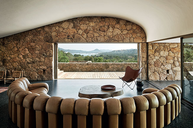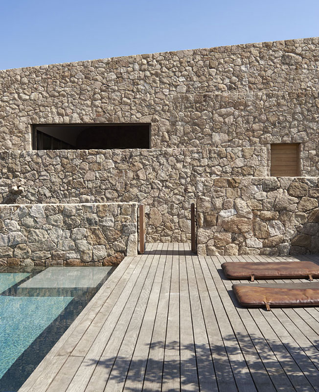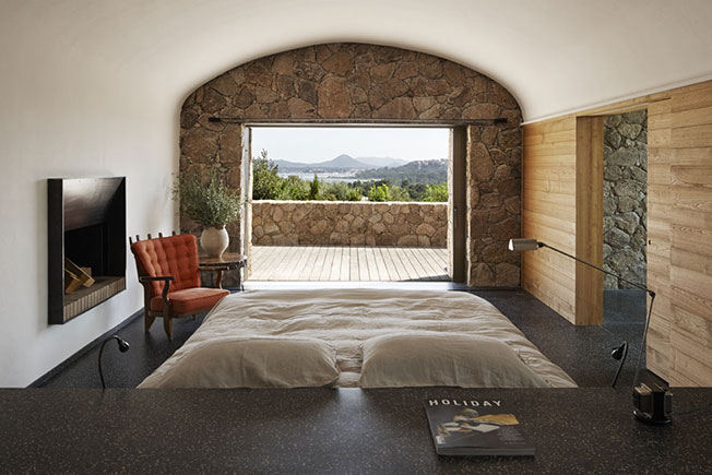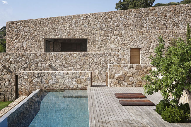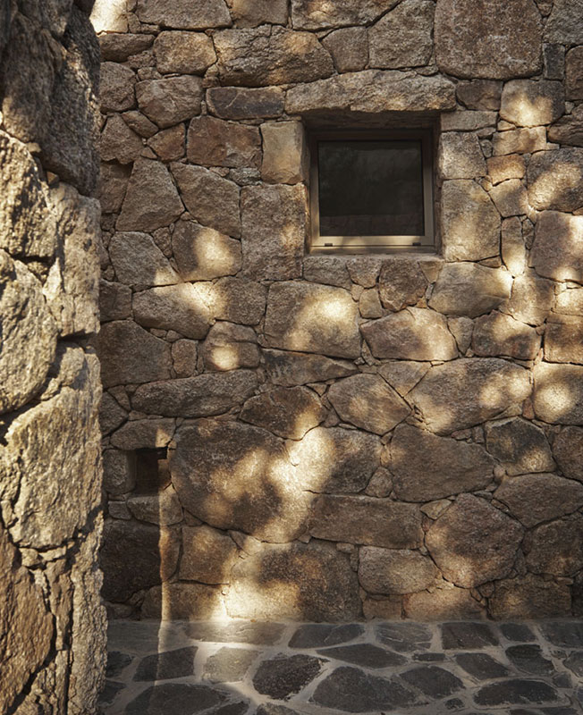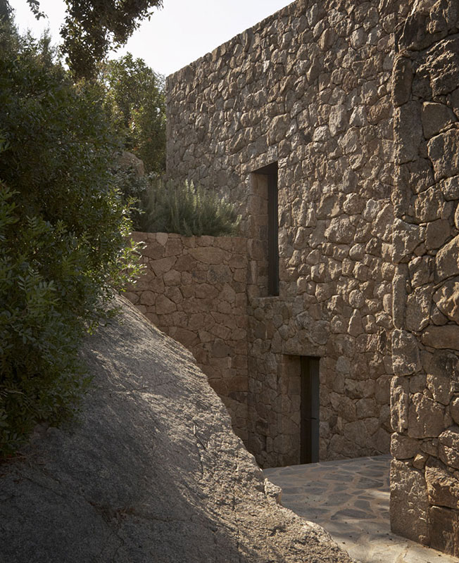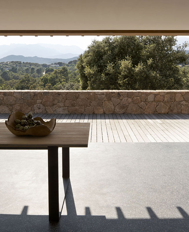 Одна из резиденций, эталонный проект Studio KO находится на Корсике. Морские камни, две прямые стены из охристого горного гребня над навесом из пробкового дуба, столь же прочные, как островной рельеф местности. Вместо того, чтобы строго придерживаться профиля вилл с красно-кедровыми крышами, череда стен обнимает холм, помогая дому вписаться в пейзаж. Один из этих валов мгновенно кажется шире, чем это должно быть: вдохновленный укреплением цитадели Корсики из Кальви, скрывающей тайную галерею, этот настоящий позвоночник дома вмещает коридоры, которые соединяют западное и восточное крыло комнат.