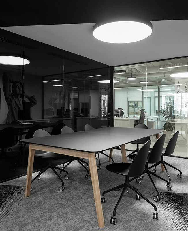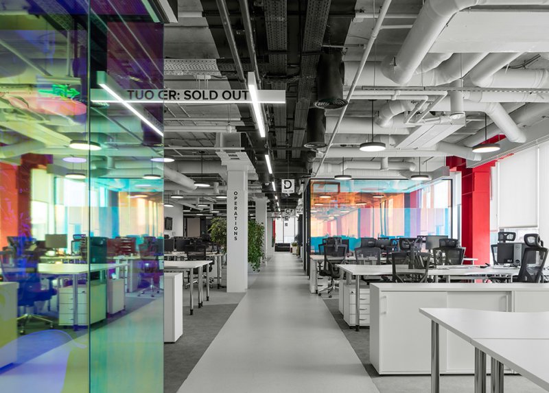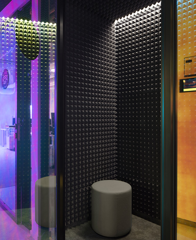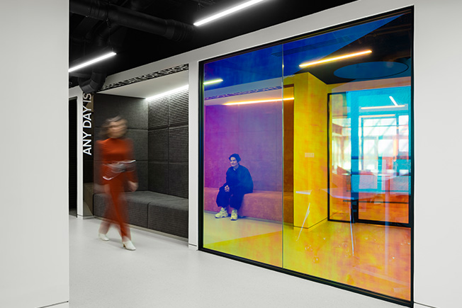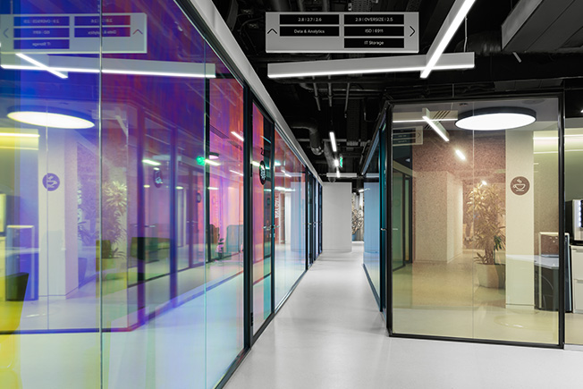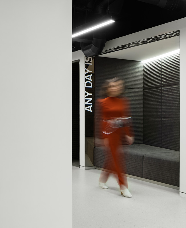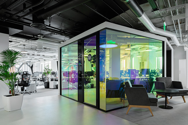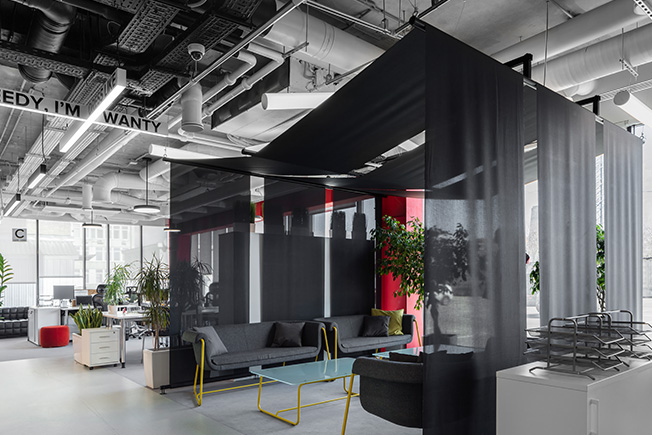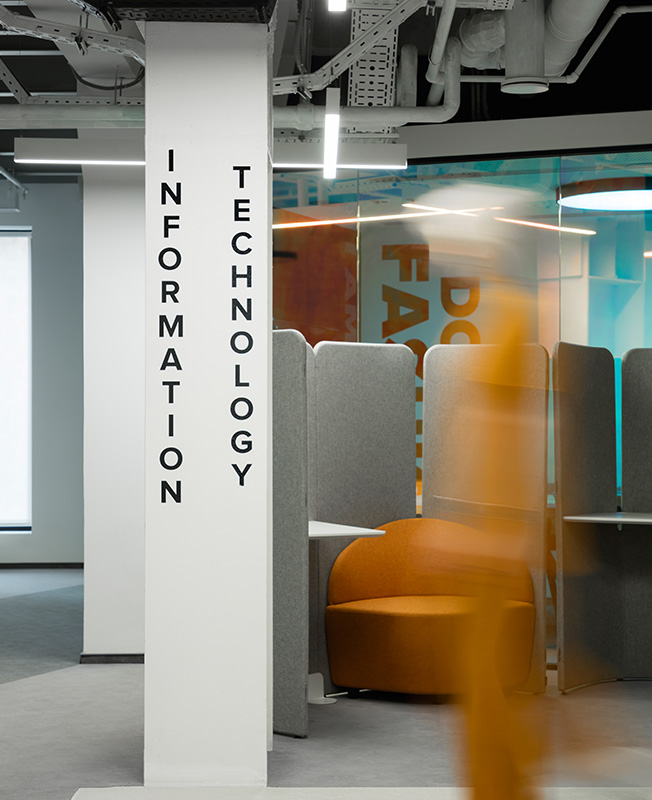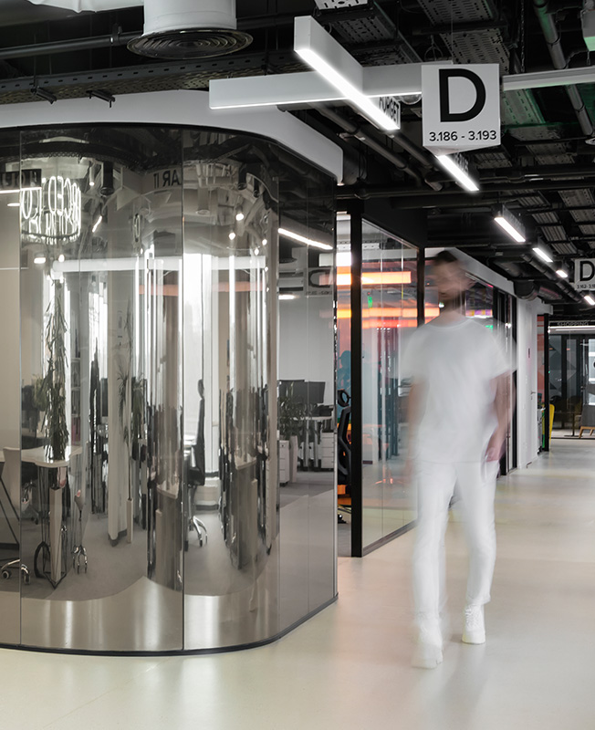 В рабочем пространстве спланированы как зоны open space, так и изолированные кабинеты, где в любой момент можно уединиться для сосредоточенной работы. От открытых рабочих зон кабинеты отделены не глухими стенами, а стеклянными перегородками. В темной части офиса, куда не доходит дневной свет, расположены разноформатные переговорные, лаунж-зоны и ниши, кофе-пойнты и телефонные кабинки.