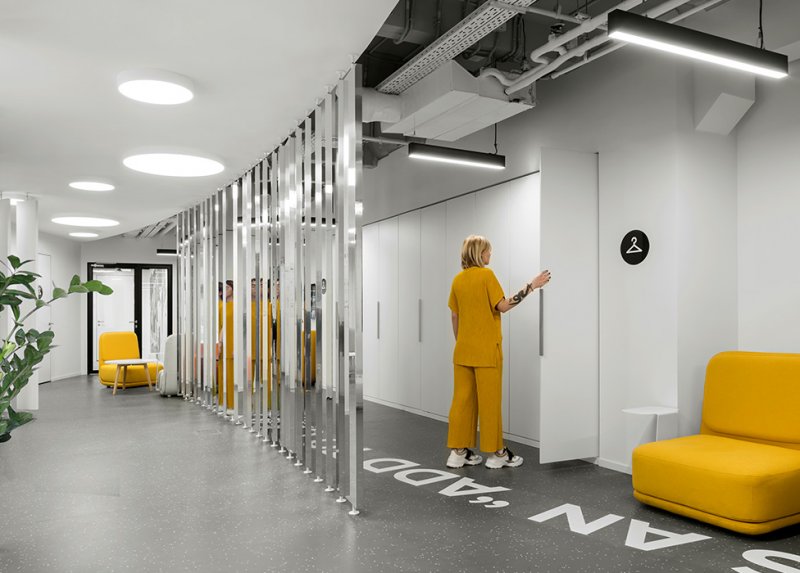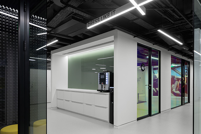 Архитекторы позаботились о комфорте персонала и предусмотрели много систем хранения — встроенные шкафы прячутся за незаметными белыми дверцами. В неформальных общих зонах можно «перезагрузиться»: поиграть в кикер, перекусить, пообщаться с коллегами.