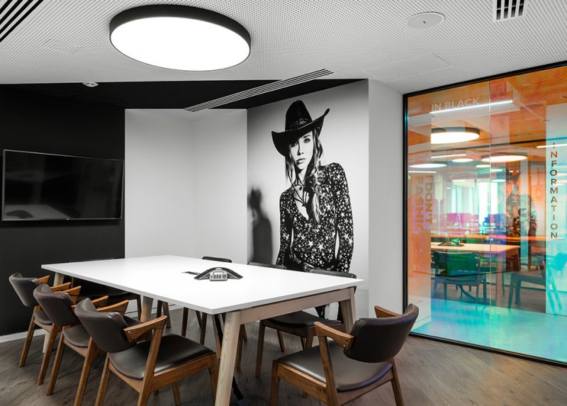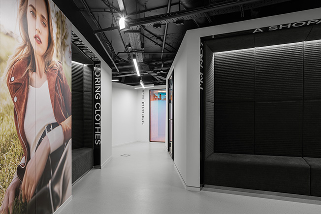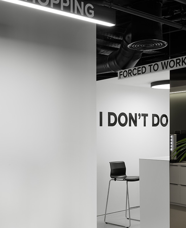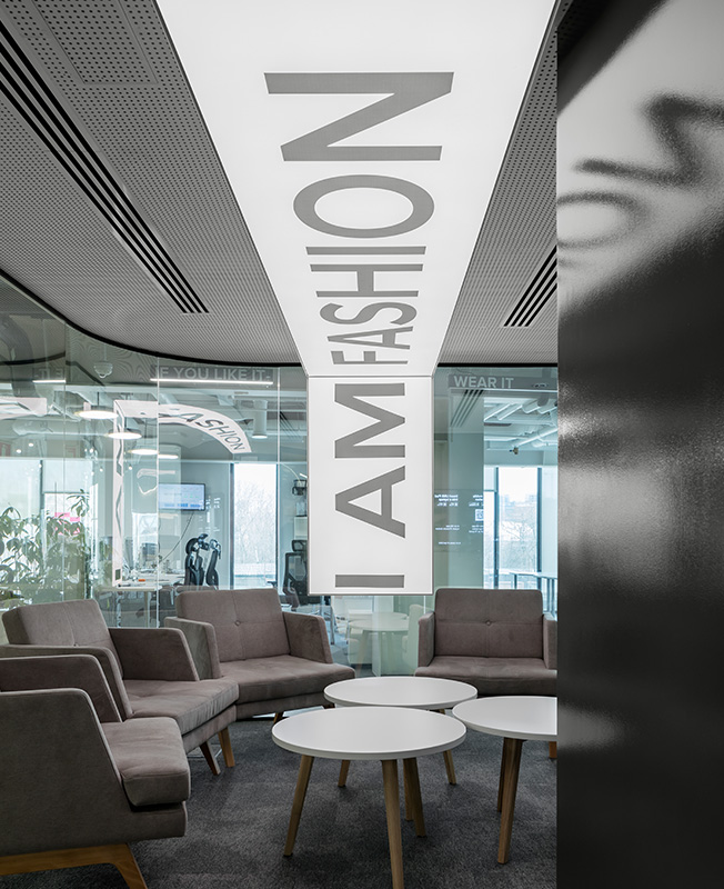 Все офисное пространство пронизано цитатами о моде, шопинге и стиле жизни. Они возникают в неожиданных местах— на линейных светильниках, индивидуально изготовленных для проекта, на полу, написанные нестираемой краской, под потолком в виде объемных букв. Интерьер отдает дань богатой истории моды: крупноформатные фотографии моделей и определенные материалы отсылают к разным эпохам.