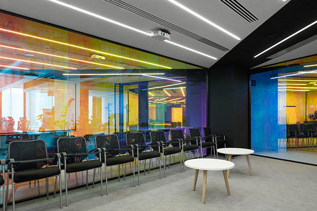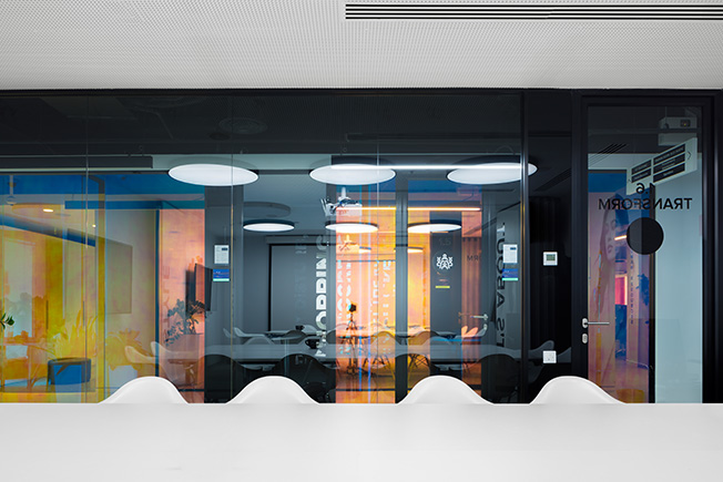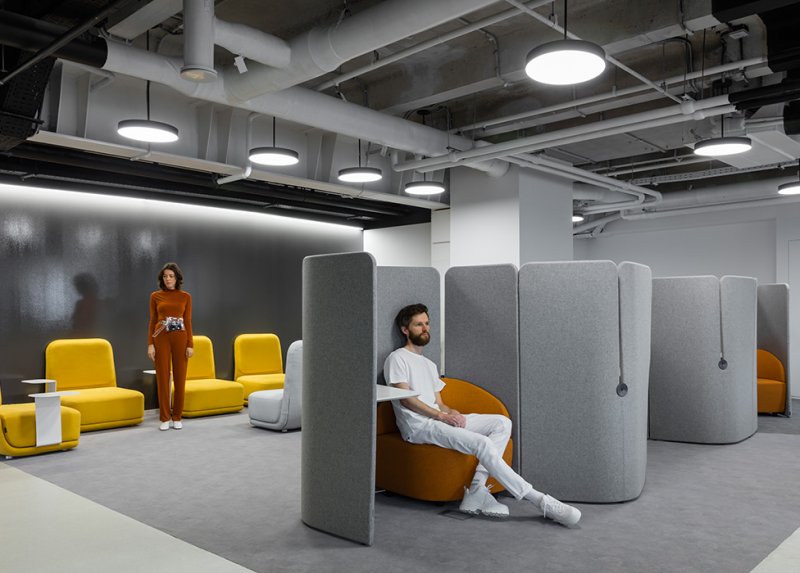 Гибкий офис подстраивается под нужды команды — авторы предусмотрели возможность трансформации. В многофункциональных лаунжах размещены акустические перегородки и мягкие группы — пуфы и диванчики актуальных форм и сочных расцветок. Используя эти компоненты, сотрудники могут менять пространство, создавая рабочие зоны именно того формата, который им необходим в данный момент. Переговорные на первом этаже быстро трансформируются в залы для проведения тренингов и семинаров.