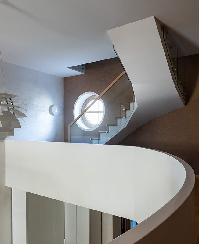 Скульптурная лестница соединяет три уровня. Светильник Artichoke бренда Louis Poulsen — классика дизайна, работа датчанина Поула Хеннингсена.