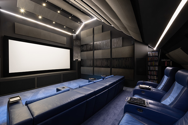 На третьем уровне оборудован домашний кинотеатр — работа над этим помещением, по признанию дизайнера, была особенно сложной.