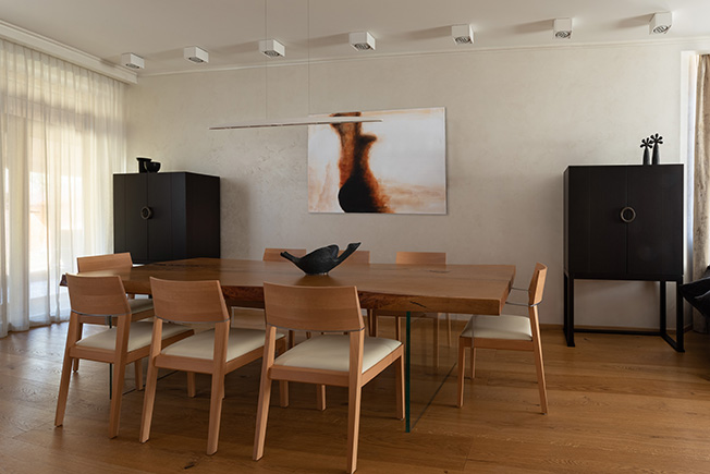 Черный, белый и оттенки натурального дерева определяют палитру дома. Стулья Tonon, шкафы Casamilano, стол изготовлен на заказ.