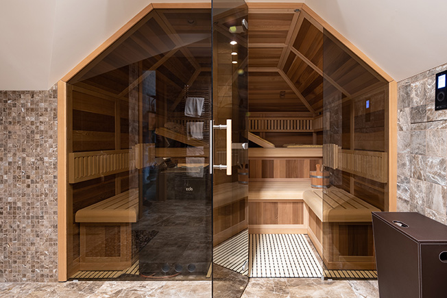 Сауна расположена на 3 этаже. В отделке использован мрамор.