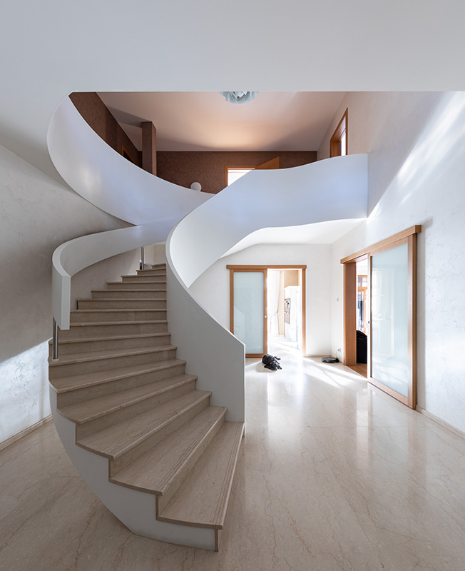 Пол на первом уровне дома отделан травертином, этот же камень — на ступенях лестницы.