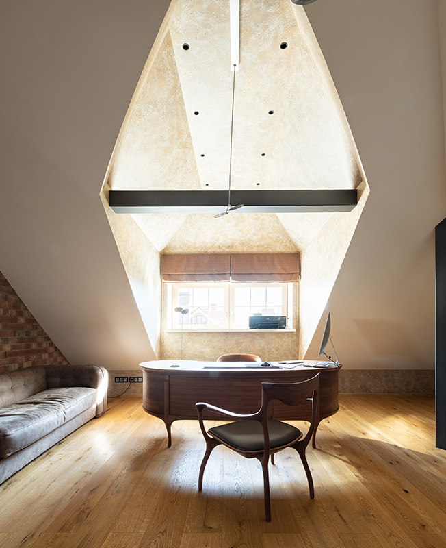 Кабинет расположили на третьем уровне под скатом крыши. Стол и кресло Ceccotti Collezioni. На полу та же массивная доска с выразительной текстурой, что и во всем доме.