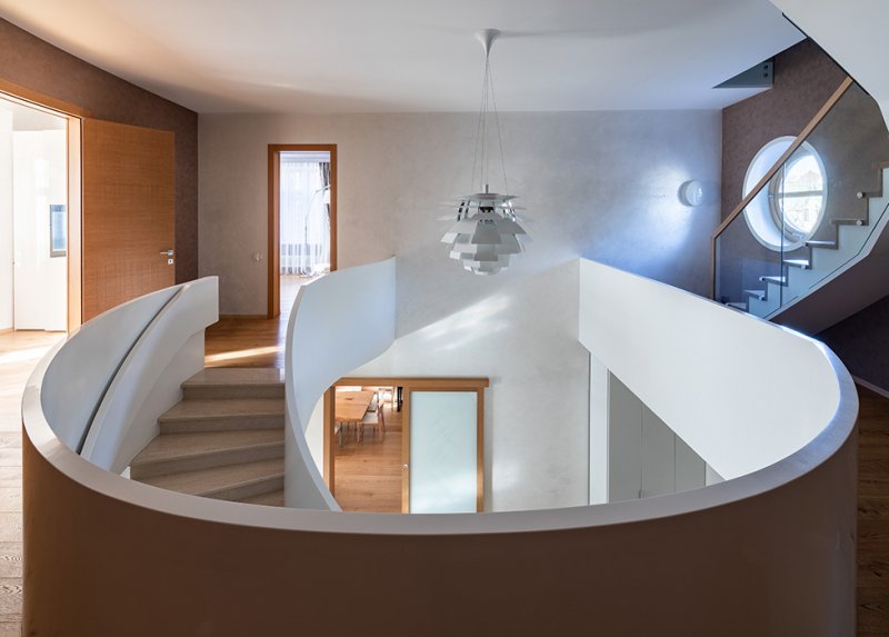 Скульптурная лестница соединяет три уровня дома. Светильник Artichoke, Louis Poulsen — классика дизайна. Датчанин Поул Хеннингсен спроектировал его в 1958 году для копенгагенского ресторана Langelinie Pavillonen, а сегодня это одна из самых известных в мире подвесных моделей.