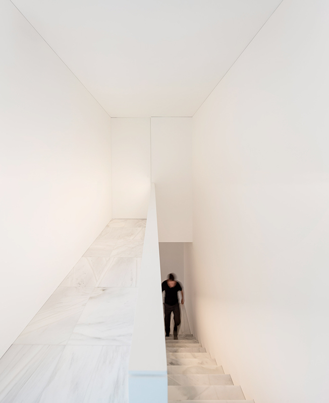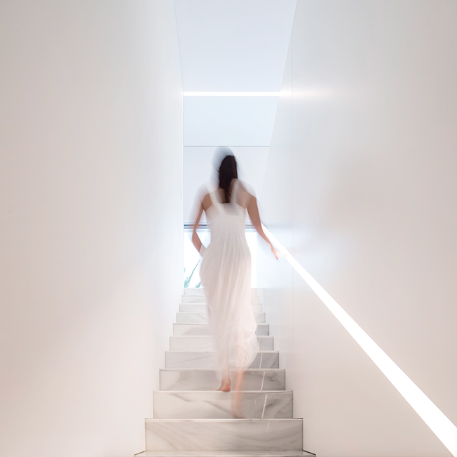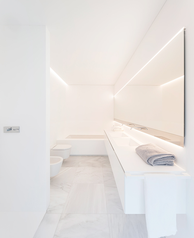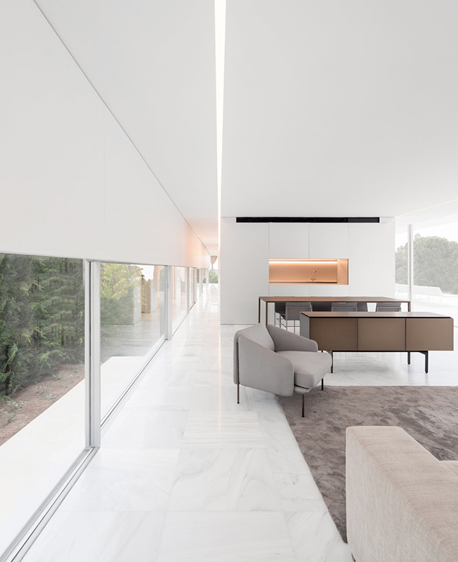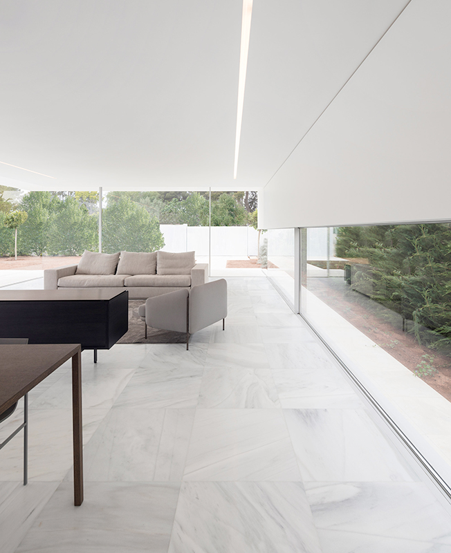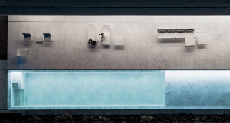 Тонкие стальные элементы конструкции контрастируют с массивным камнем и мрамором, который используется как внутри, так и снаружи: в отделке помещений, бассейна и террасы. Материалы и их оттенки выбраны так, чтобы максимально отражать свет во всем пространстве.