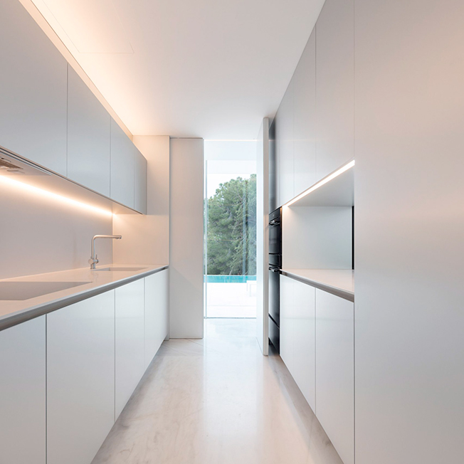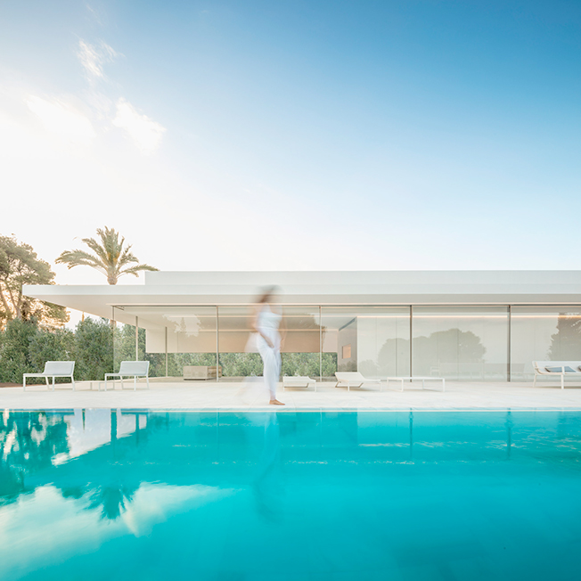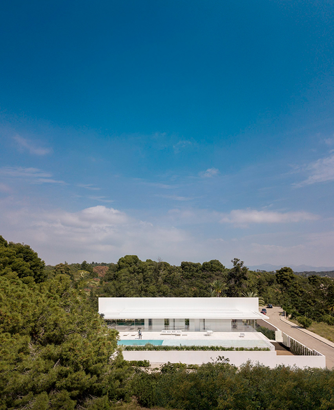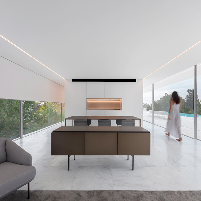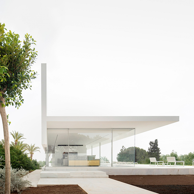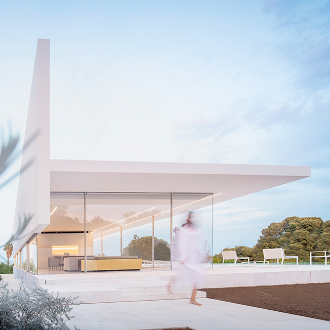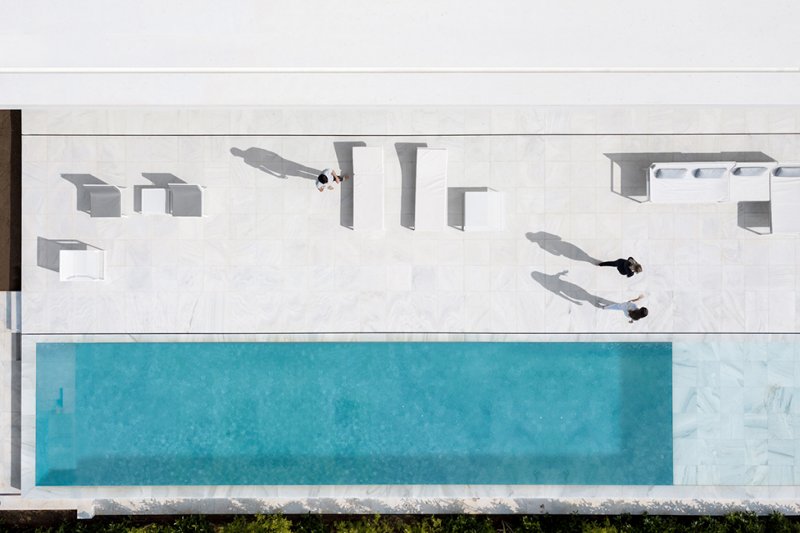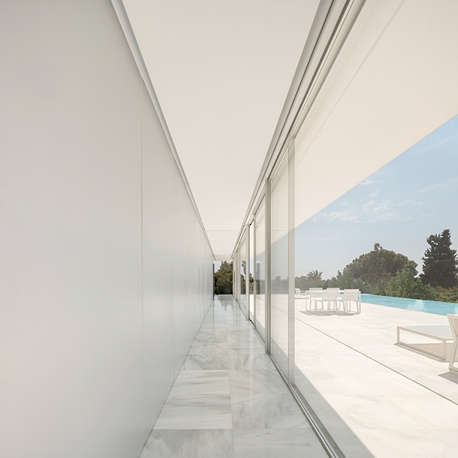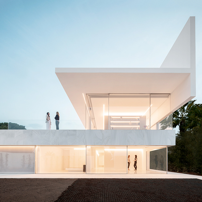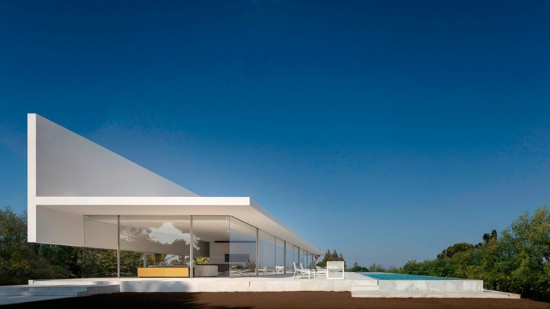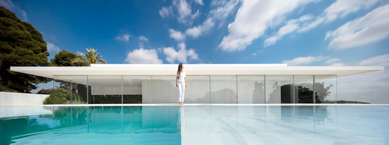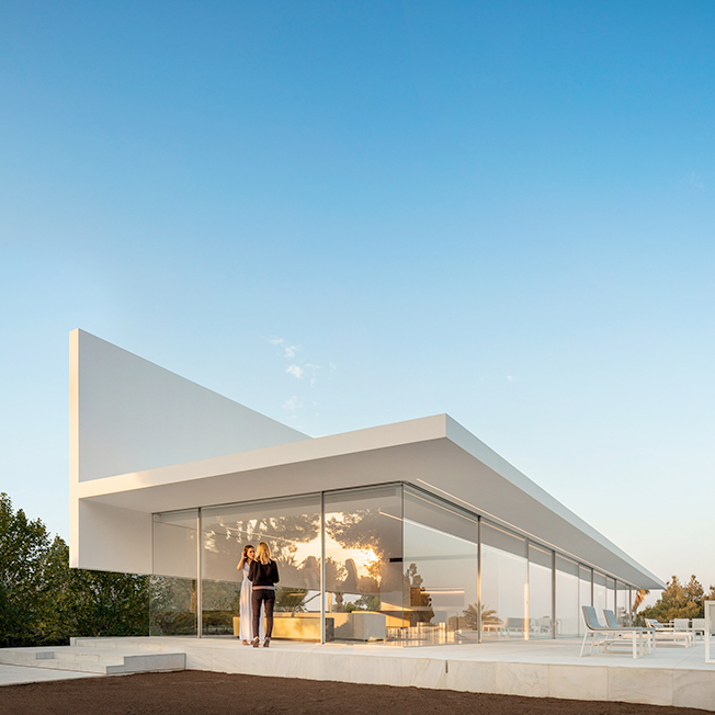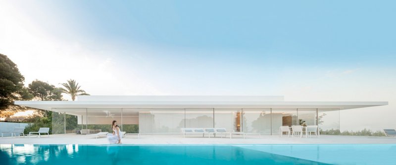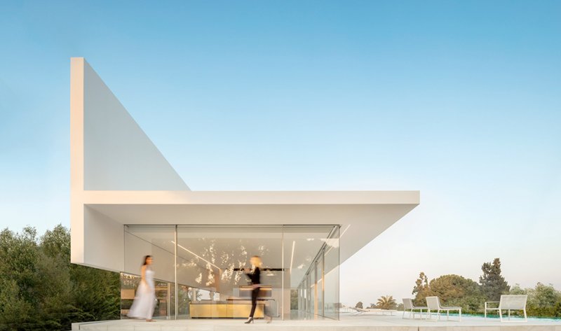 Испанское бюро Fran Silvestre Arquitectos под руководством архитектора Франа Сильвестре спроектировало жилой дом в Валенсии. Главная особенность здания — крыша, по которой можно гулять и отдыхать, наслаждаясь видами окрестностей. Hoffman House, напоминающий о модернистских постройках, играет с идеями открытости и приватности. Само здание похоже на стеклянную коробку, накрытую T-образной кровлей, но оно ориентировано таким образом, чтобы уберечь жильцов от любопытных взглядов и обеспечить уединение в частных зонах. По словам Франа Сильвестре, из-за неровного рельефа местности дом поднимается над уровнем земли, что позволяет ему «смотреть», оставаясь невидимым. Спальни расположены в блоке, вынесенном в центр помещения. Он облицован алюминиевыми панелями, которые выделяют эту часть дома. Раздвижные двери позволяют объединить пространство спален с зоной гостиной, выходящей на террасу с бассейном. Hoffman House стоит на каменном «подиуме», который визуально отделяет постройку от окружающей природы. Там, где участок уходит вниз, под этим каменным основанием появился нижний уровень. В нем расположены подвал и гараж, из которого можно попасть в дом по внутренней лестнице. Вертикальный выступ крыши одновременно защищает дом от глаз соседей и огораживает с одной из сторон прогулочную террасу на крыше. Горизонтально крыша тоже выходит за пределы стеклянной «коробки», формируя навесы от южного солнца. Тонкие стальные элементы конструкции контрастируют с массивным камнем и мрамором, который используется как внутри, так и снаружи: в отделке помещений, бассейна и террасы. Материалы и их оттенки выбраны так, чтобы максимально отражать свет во всем пространстве.