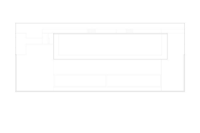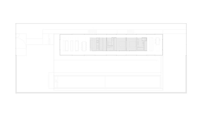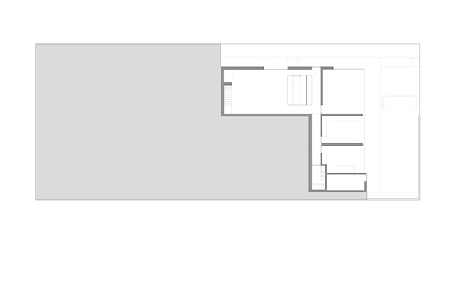 Вертикальный выступ крыши одновременно защищает дом от глаз соседей и огораживает с одной из сторон прогулочную террасу на крыше. Горизонтально крыша тоже выходит за пределы стеклянной «коробки», формируя навесы от южного солнца.