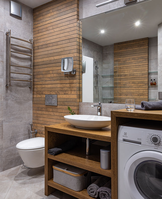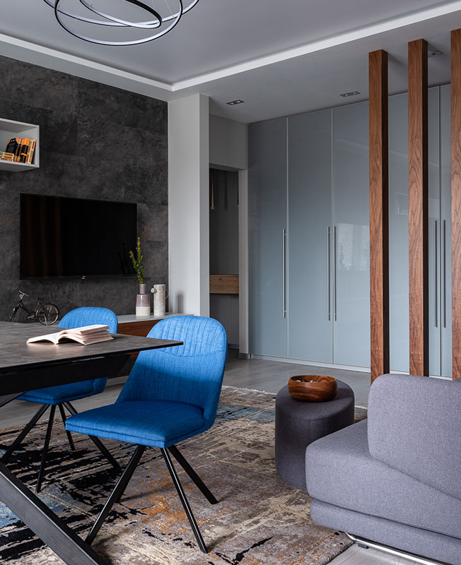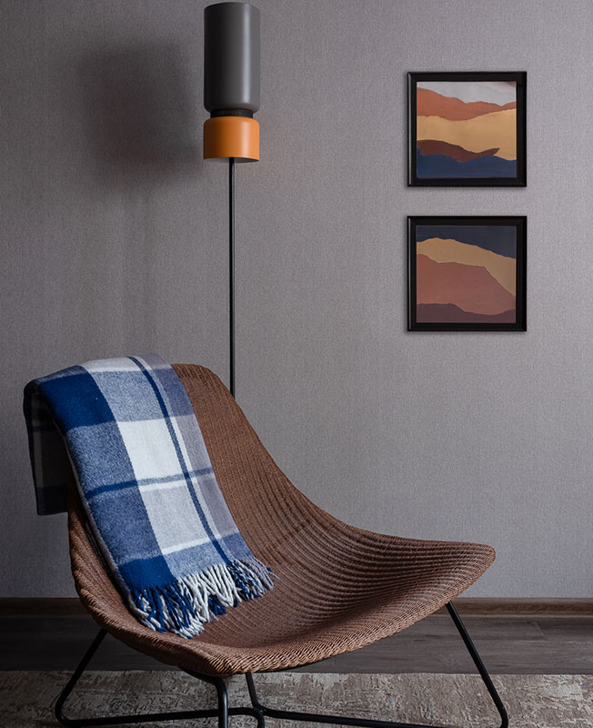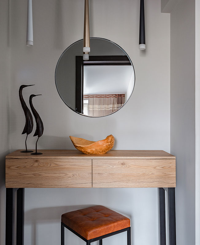 Анна сосредоточилась на создании гармоничного интерьера, в котором были бы сбалансированы феминные и мускулинные элементы. С одной стороны, в квартире много серого цвета, применены поверхности с потертостями, а также древесина, бетон, камень. Брутальные материалы и сдержанная палитра уравновешена терракотовыми оттенками, предметами мебели и декором с округлыми и плавными формами.