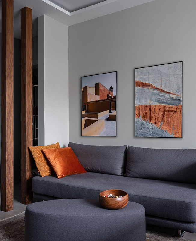 Фрагмент гостиной. Зона прихожей отделена от гостиной столбами из древесины ореха. Диван, THECA. Фото, Евгений Гнесин. Картина, Елена Новоселова.