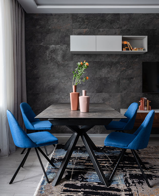 Обеденная зона. Столешница выполнена из керамогранита. Тумба для ТВ изготовлена на заказ по эскизам дизайнера.