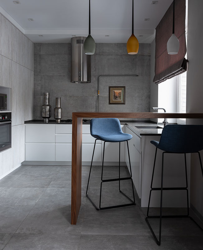 Кухня. Гарнитур изготовлен на заказ по эскизам дизайнера. Барные стулья, DG Home. Фартук, крупноформатный керамогранит, Porcelanosa. На полу плитка Porcelanosa.