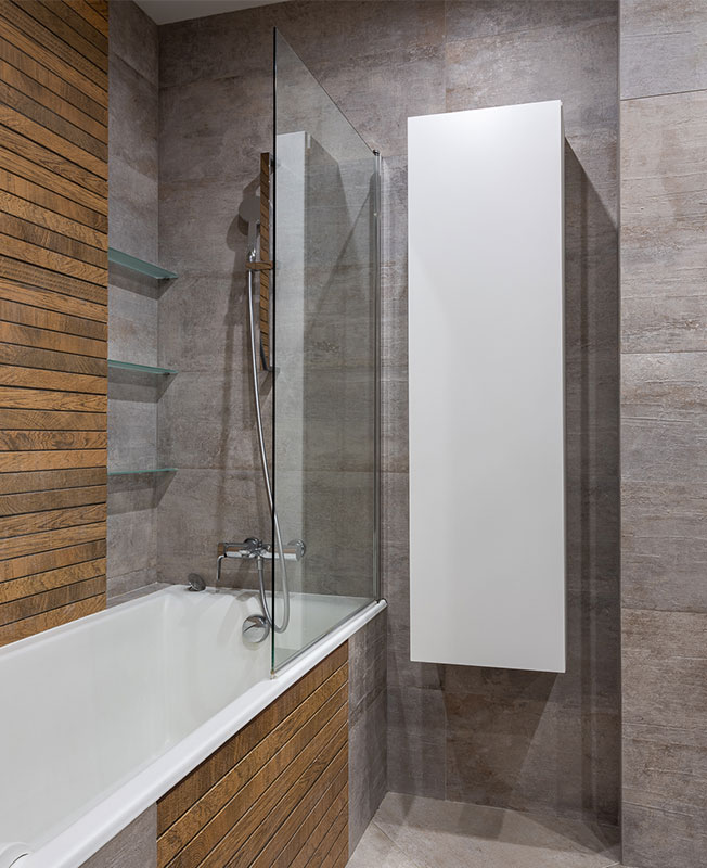 Демонтаж также преподнес пару неприятных сюрпризов — асфальт вместо стяжки на полу, замурованные вентиляционные каналы и др. Квартиру приобрели уже с небольшой перепланировкой — объединенными санузлами, измененным входом на кухню.