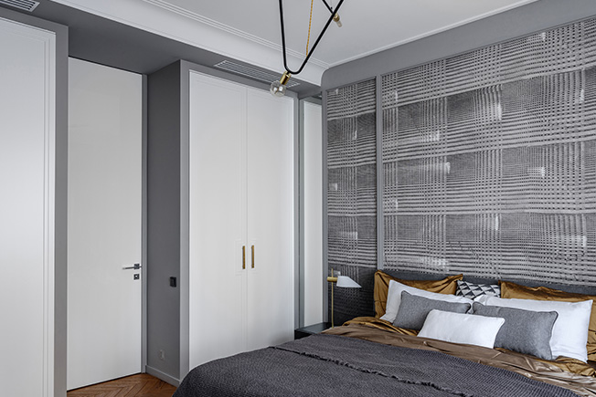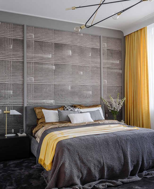 Удивительно, что заказчик согласился сделать деревянное панно на стене с телевизором: паркет будто перетекает на стену. Декор напомнил моему клиенту символ инь-ян. В спальне используются градиентные, черные с серым обои. Я решила развить идею, добавила черные тумбы и ковер: они переходят в серую кровать, а затем в обои, которые светлеют к потолку.