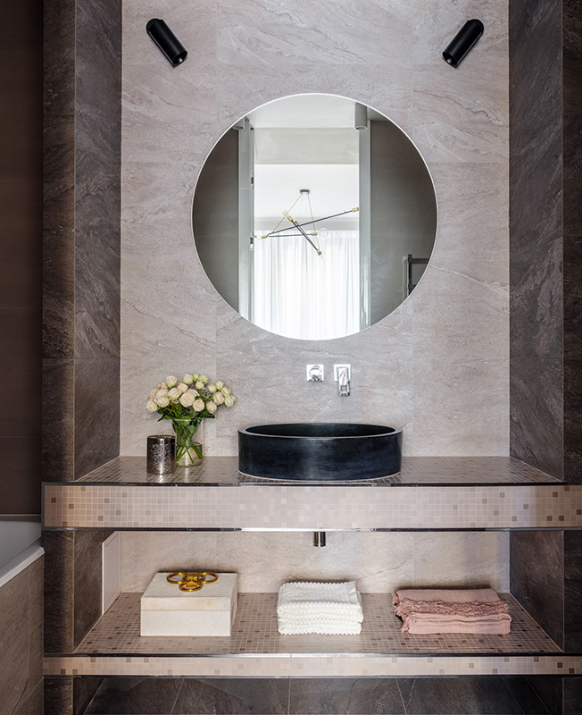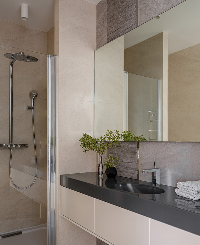 Ванная при спальне отделана керамогранитом Porcelanosa.