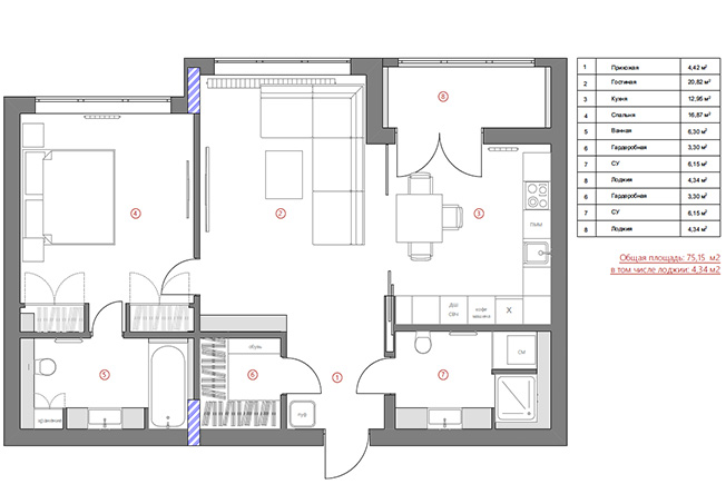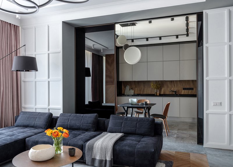 Еще заказчик хотел гардеробную при спальне, а я сделала два больших шкафа: места для хранения получилось столько же, но при этом спальня более просторна. Относительно кухни мы пришли к компромиссу: установили между кухней и гостиной раздвижную перегородку.