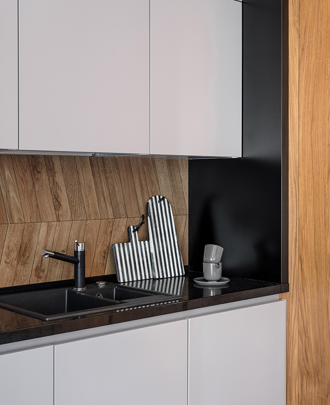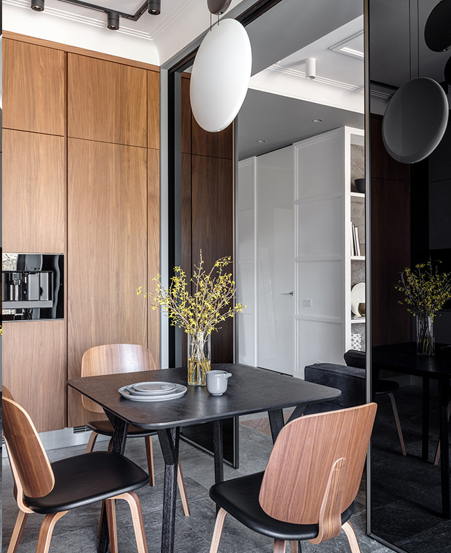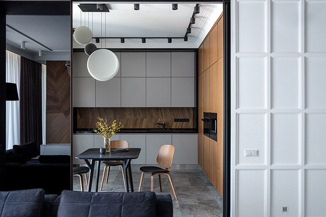 Кухня Aster Cucine. Стол The Idea. Стулья BoConcept. Фартук кухни оформлен керамической плиткой под дерево от Porcelanosa. Бытовая техника Smeg. Екатерина Дементьева спроектировала квартиру 75 кв. метров в московском ЖК Redside. Заказчик — мужчина средних лет, своими приоритетами на первой встрече назвал простоту и логичность. Однако в качестве примера того, что нравится, показал отнюдь не простые, классические интерьеры. Дизайнеру удалось согласовать одно с другим. «Когда я пришла на проект, то увидела прекрасное свободное пространство прямоугольной формы: в моей голове тут же выстроилась примерная планировка, — вспоминает Екатерина Дементьева. — Сложность была в том, что заказчик хотел все помещения сделать изолированными: чтобы в санузлы и кухню был доступ из коридора. Кухня Aster Cucine. Стол The Idea. Стулья BoConcept. Белый куб гардеробная-стеллаж выделяется на сером фоне, подчеркивая простоту и логичность планировки. Кухня Aster Cucine. Мойка и смеситель Blanco. Фартук кухни оформлен керамической плиткой под дерево от Porcelanosa. Он привык так жить и не представлял, что бывает по-другому — удобнее, эргономичнее. Планировка стала самым долгим этапом в наших согласованиях. К счастью, потом клиент понял, что в этой квартире подобная структура нерациональна. И просто доверился мне, чему сейчас рад. В современный по формам и планировке интерьер дизайнер добавила классические карнизы и молдинги. Главный компонент в гостиной — диван Minotti. Потолочный светильник «Центрсвет» и столик BoConcept обыгрывают мотив круга. Торшер — четкий графичный акцент, также от BoConcept. nonehttps://www.instagram.com/dem.interior/nonenone Еще заказчик хотел гардеробную при спальне, а я сделала два больших шкафа: места для хранения получилось столько же, но при этом спальня более просторна. Относительно кухни мы пришли к компромиссу: установили между кухней и гостиной раздвижную перегородку. Кухня отделена от гостиной раздвижной перегородкой, что позволяет варьировать планировку. Декор стен согласован с членением фасадов кухни Aster Сucine. Арт: Кристина Агельская. Как и просил заказчик, квартира получилась простой по форме. Прямолинейность смягчена карнизом и молдингами на стенах и потолке. Эти детали отсылают к классике, что также во вкусе хозяина. Материалы простые и понятные, основные — дерево и керамогранит. Кухня отделена от гостиной раздвижной перегородкой, что позволяет варьировать планировку. Роскошный диван Minotti дизайна Родольфо Дордони доминирует в парадной половине. Столик и торшер BoConcept. В кухне-столовой светильник Vibia. Удивительно, что заказчик согласился сделать деревянное панно на стене с телевизором: паркет будто перетекает на стену. Декор напомнил моему клиенту символ инь-ян. В спальне используются градиентные, черные с серым обои. Я решила развить идею, добавила черные тумбы и ковер: они переходят в серую кровать, а затем в обои, которые светлеют к потолку. Декор стены продолжает покрытие пола. Дверь ведет в спальню. Тумба под ТВ изготовлена на заказ. Прихожая. Банкетка Sancal. Зеркало Angel Cerda. На сером фоне выделяется белый куб «гардеробная плюс стеллаж», подчеркивая простоту и логичность планировки. Мебель выбирали прежде всего с точки зрения практичности: заказчик не любит кричащих вещей, но ценит качество всего, к чему прикасается. Для меня самый примечательный в интерьере предмет — это роскошный диван Minotti. Сте