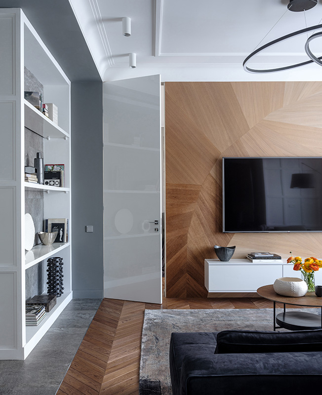 Декор стены продолжает покрытие пола. Дверь ведет в спальню. Тумба под ТВ изготовлена на заказ.
