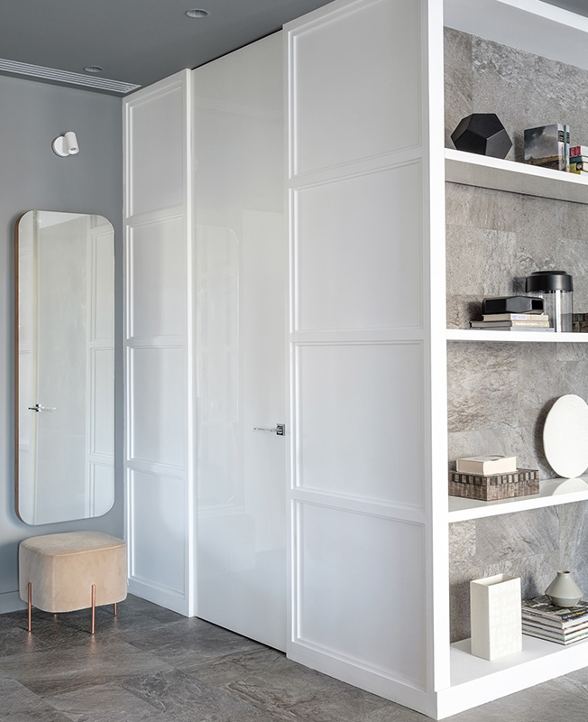Прихожая. Банкетка Sancal. Зеркало Angel Cerda. На сером фоне выделяется белый куб «гардеробная плюс стеллаж», подчеркивая простоту и логичность планировки.