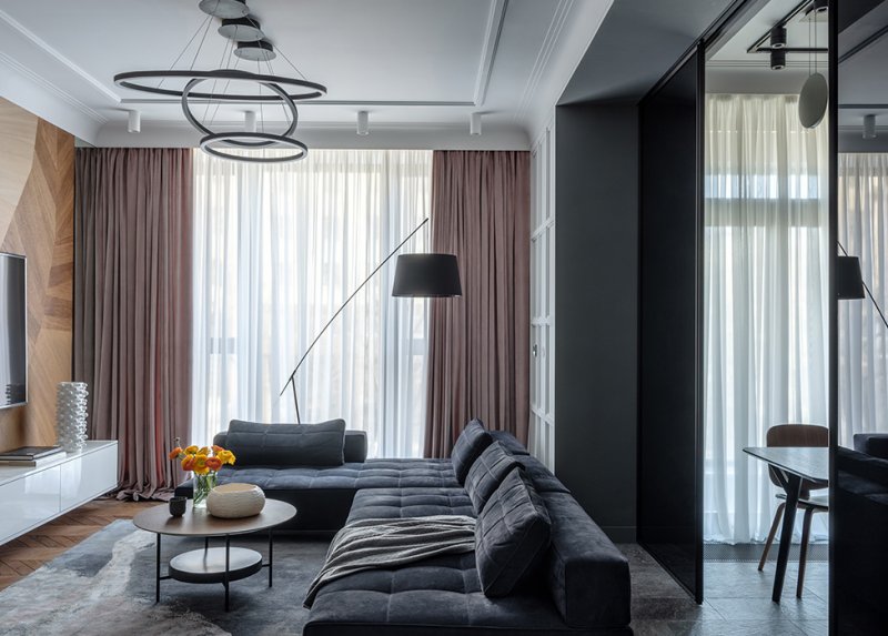 В современный по формам и планировке интерьер дизайнер добавила классические карнизы и молдинги. Главный компонент в гостиной — диван Minotti. Потолочный светильник «Центрсвет» и столик BoConcept обыгрывают мотив круга. Торшер — четкий графичный акцент, также от BoConcept. nonehttps://www.instagram.com/dem.interior/nonenone