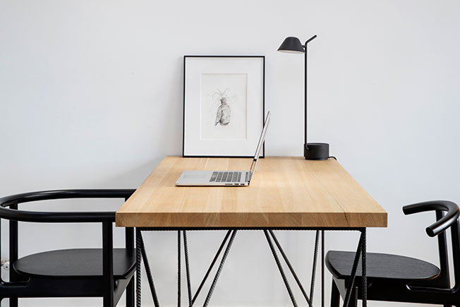 Стены выкрасили в светлый оттенок, рабочие столы и стеллажи сделали своими силами из деревянных щитов и обычной строительной арматуры в черном цвете.