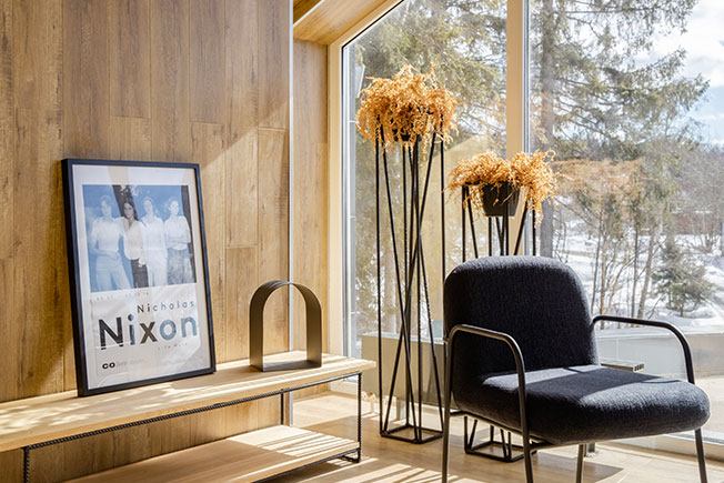 Офис продаж поддерживает идею всего проекта. Здание окружает красивый еловый лес. Сама природа подсказала авторам самое логичное и правильное решение — панорамные окна, чтобы максимально сохранить вид и стереть границы между интерьером и экстерьером.