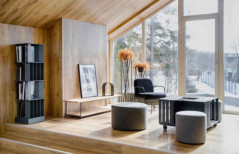 Зоя Волкова и Алиса Морозова, Архитектурное бюро 2.0 оформили интерьер офиса продаж для девелоперской компании M9 development. Объект расположен в здании въездной группы коттеджного поселка RADOSTЬ, для которого архитекторы бюро также разрабатывали генплан, проектировали все жилые дома и общественные пространства в едином архитектурном стиле. Концепция поселка переосмысливает понятие «дача» в современном контексте. «Покупатели через какое-то время даже начали говорить, что это «Дача 2.0». Тогда же родилось и название нашего бюро», — рассказывают Зоя и Алиса. На стенах — графика художника Евгения Гранильщикова. Офис продаж поддерживает идею всего проекта. Здание окружает красивый еловый лес. Сама природа подсказала авторам самое логичное и правильное решение — панорамные окна, чтобы максимально сохранить вид и стереть границы между интерьером и экстерьером. Решение «домик в домике» также было обусловлено и конструкционными особенностями здания с разным уровнем потолков на нижнем этаже. Также архитекторы предусмотрели выход на эксплуатируемую ловлю, где можно насладиться окружающими пейзажами. nonehttps://www.instagram.com/ab20.io/https://www.facebook.com/ARCHBURO2.0/https://ab20.io/ru «Нам очень повезло с заказчиком. Девелоперы предоставили нам полную свободу в проектировании въездной группы поселка, обозначив только бюджет и сроки. Поэтому нам пришлось поломать голову, как создать максимальный результат минимальными средствами». На площади 35 кв. метров мы разместили зону презентаций (мягкая группа на подиуме), рабочие места для сотрудников, переговорную, кухню с санузлом и компактную игровую для покупателей с детьми. Презентационную зону выделили ламинатом на полу, стенах и потолке. ерные стулья от UNIKA M?BLAR, металлический стеллаж, табуреты и кресло от бренда ARCHIPELAGO, а также свет и аксессуары от Menu. Символом и одновременно логотипом проекта был выбран силуэт традиционного деревенского домика, но в современной минималистичной интерпретации. Внутри объем визуально разделен на две основные части при помощи приема «домик в домике». Презентационную зону выделили ламинатом на полу, стенах и потолке. Стены выкрасили в светлый оттенок, рабочие столы и стеллажи сделали своими силами из деревянных щитов и обычной строительной арматуры в черном цвете. Архитектура поселка имеет нордический характер, а потому мебель мы искали в таком же сдержанном современном стиле. Черные стулья от UNIKA M?BLAR, металлический стеллаж, табуреты и кресло от бренда ARCHIPELAGO, а также свет и аксессуары от Menu. На стенах — графика художника Евгения Гранильщикова и загадочный женский абрис иллюстратора Никиты Лукьянова».