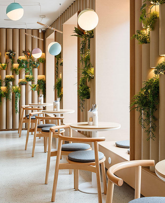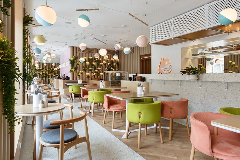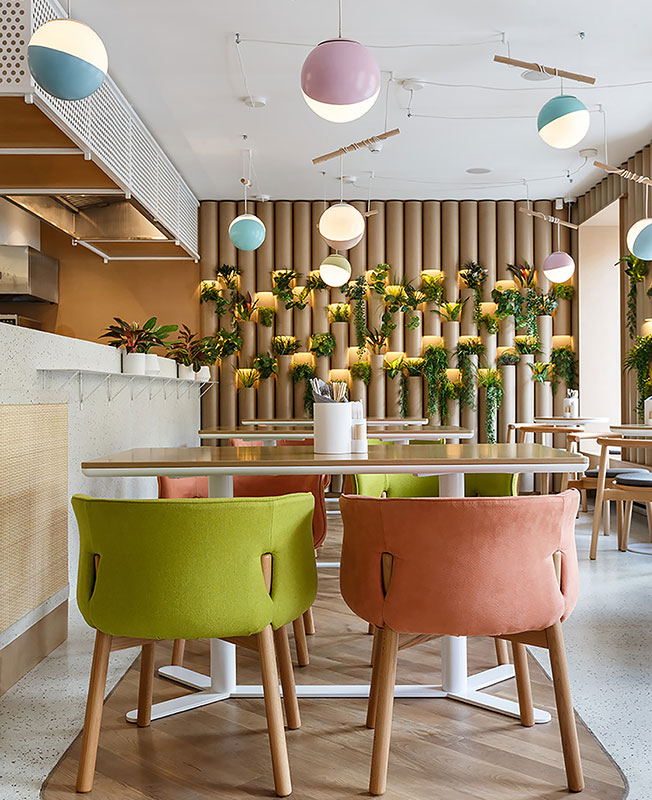 Интерьер кафе Bao Mochi в Санкт-Петербурге — работа Марата Мазура. Дизайнер соединил азиатские мотивы, террацо и живые растения. В основе меню Bao Mochi — азиатская кухня: в первую очередь, паровые булочки бао и японские пирожные моти из рисовой муки. Эти же блюда, давшие кафе название, легли в основу планировочного решения для пространства площадью 188 кв. метров. Есть зал Bao с открытым горячим цехом и зал Mochi, где внимание привлекают ниши с разноцветными полусферами, напоминающими пирожные моти. nonehttps://www.instagram.com/maratmazur/https://www.facebook.com/marat.mazurhttps://www.maratmazur.ru/ В оформлении стен дизайнер использовал гильзовый картон, который напоминает стволы бамбука и отсылает к культуре Китая, Японии и Таиланда. С этой отделкой соседствуют светлые полы и столешницы с терраццо, стулья и светильники округлых форм, по мнению автора проекта, напоминающие пельмени — также популярное блюдо азиатской кухни. Эффектная деталь — «парящий» в воздухе барный стол, столешница которого крепится к потолку. Главным украшнием интерьера стали элементы ярких цветов, выделяющиеся на нейтральном фоне, и многочисленные живые растения.